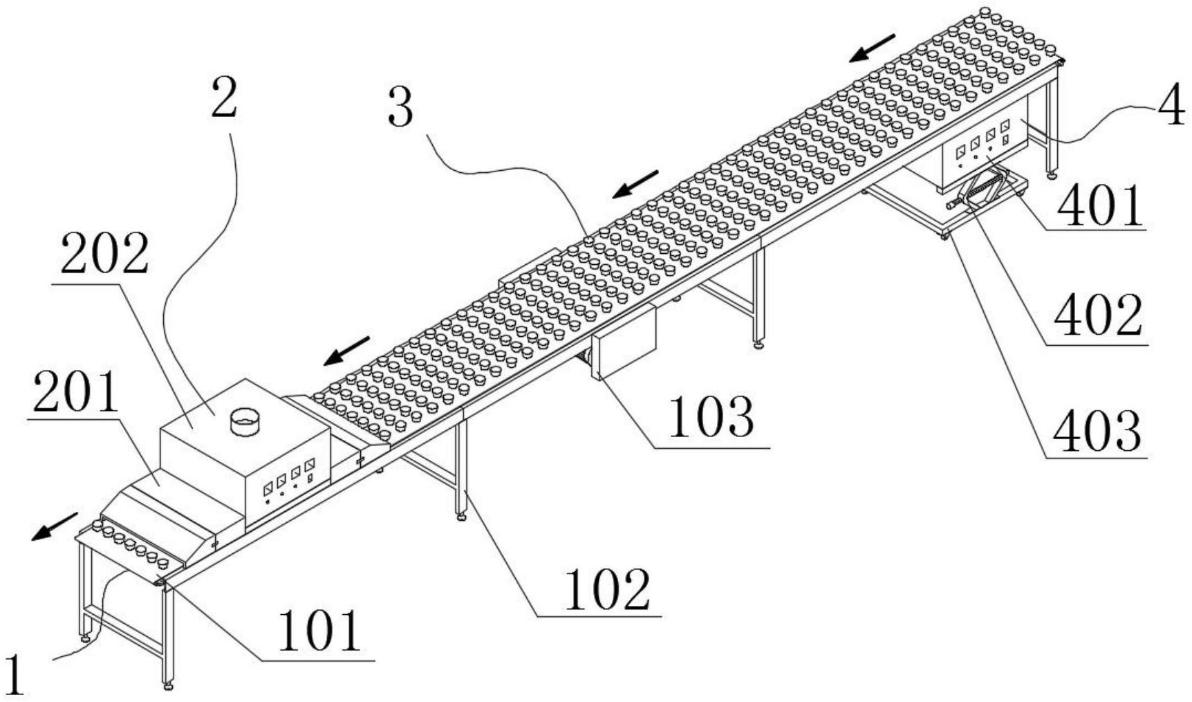本实用新型公开了蛋糕生产消毒技术领域的一种用于全套生产线的紫外线杀毒装置,该装置包括有输送装置和顶部消毒装置,所述输送装置上放置有蛋糕,本实用新型通过在蛋糕输送带上设置顶部消毒装置,能够对冷却后的蛋糕进行紫外线消毒灭菌处理,以保证蛋糕的卫生质量,且反射挡板的设置,使得紫外线杀菌效果更好;同时抽风机以及滤网等结构,能够消除紫外线灭菌过程的升温影响,通过设置的底部消毒装置,能够对传送带的表面进行消毒,其作用是杀灭皮带表面的细菌,确保皮带在由底部向顶部反转并接住蛋糕时皮带表面的洁净;且底部消毒装置可进行升降调节,便于对其进行清理。