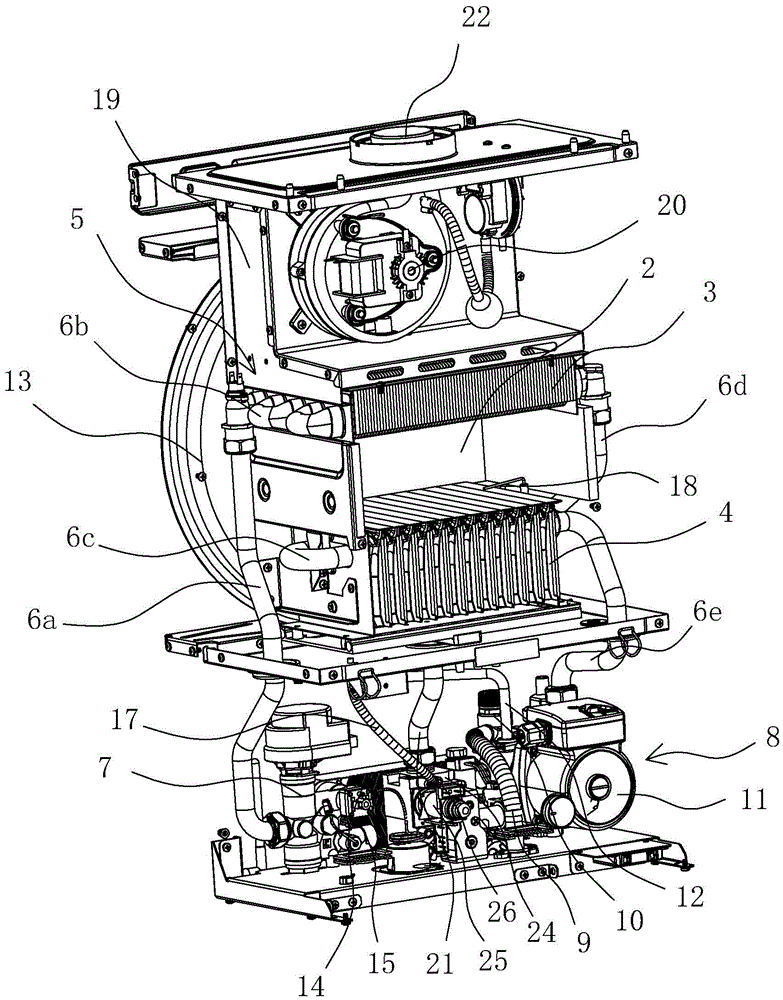 本实用新型提供了一种具有内置WiFi装置的智能组网型燃气采暖热水炉,属于采暖热水炉技术领域。它包括壳体,壳体内设有燃烧室,所述的壳体内还设有无线接收器安装腔,所述的燃烧室顶部以及底部各设有若干块水平均匀排列的上热交换板和下热交换板,所述的燃烧室内还设有加热管道,加热管道沿水平方向贯穿若干块上热交换板和下热交换板。燃烧室内通天然气燃烧发热,加热管道位于燃烧室内并可通过天然气燃烧的热量对加热管道内的液体进行加热,上热交换板和下热交换板能加快将天然气燃烧的热量转化为液体处的转换效率,增加工作效率。