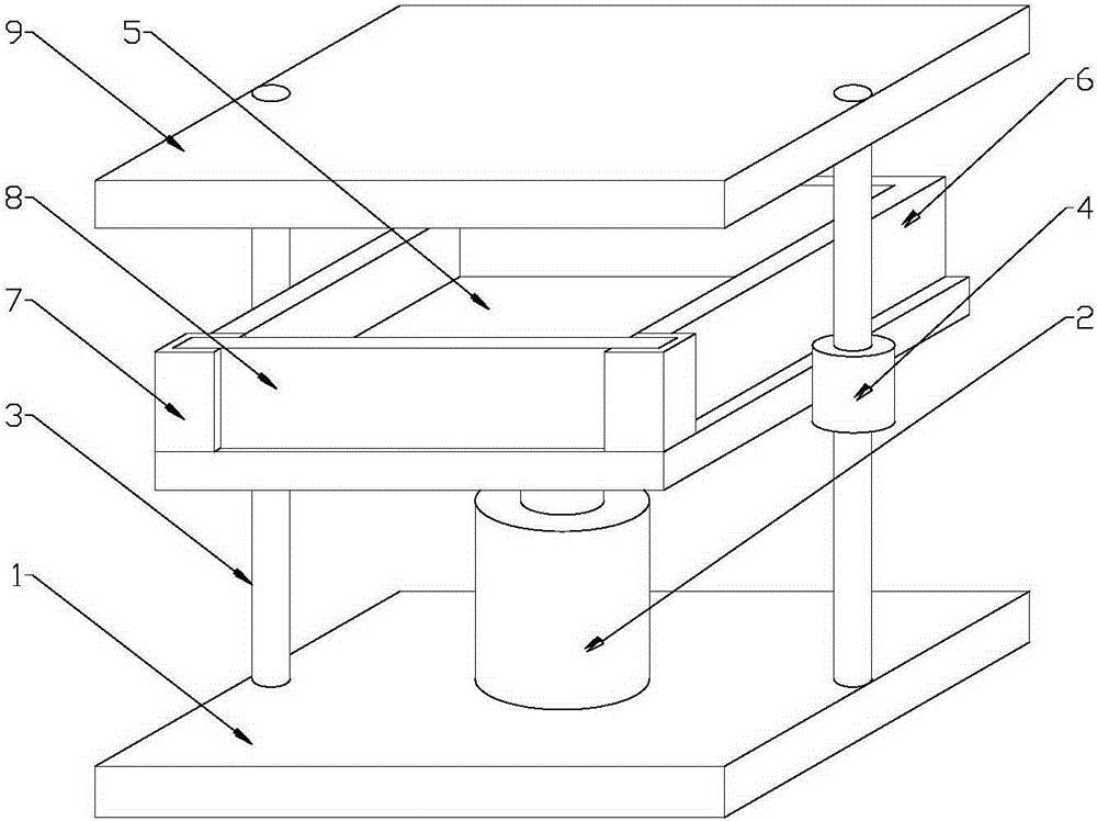 本实用新型公开了一种冷鲜肉压板成型机,其包括底座,底座顶面中部竖直设有推动液压缸,底座顶面上对称竖直设有一对滑轨,每根滑轨上设有一个滑动座,滑动座与滑轨之间滑动接触,两滑动座之间设有活动板,活动板底部与推动液压缸的活塞端固定连接,活动板的顶面上设有凵形边框,凵形边框的两侧边顶部对称设有一对开口相对的卡槽,两卡槽之间活动插接有定型板,两滑轨顶部之间固定设有挤压板。本实用新型的优点在于,可真空包装后的冷鲜肉制品挤压成型,成型后的冷鲜肉制品外形规整,储存或装箱时可节省占用空间,降低库存和包装成本。