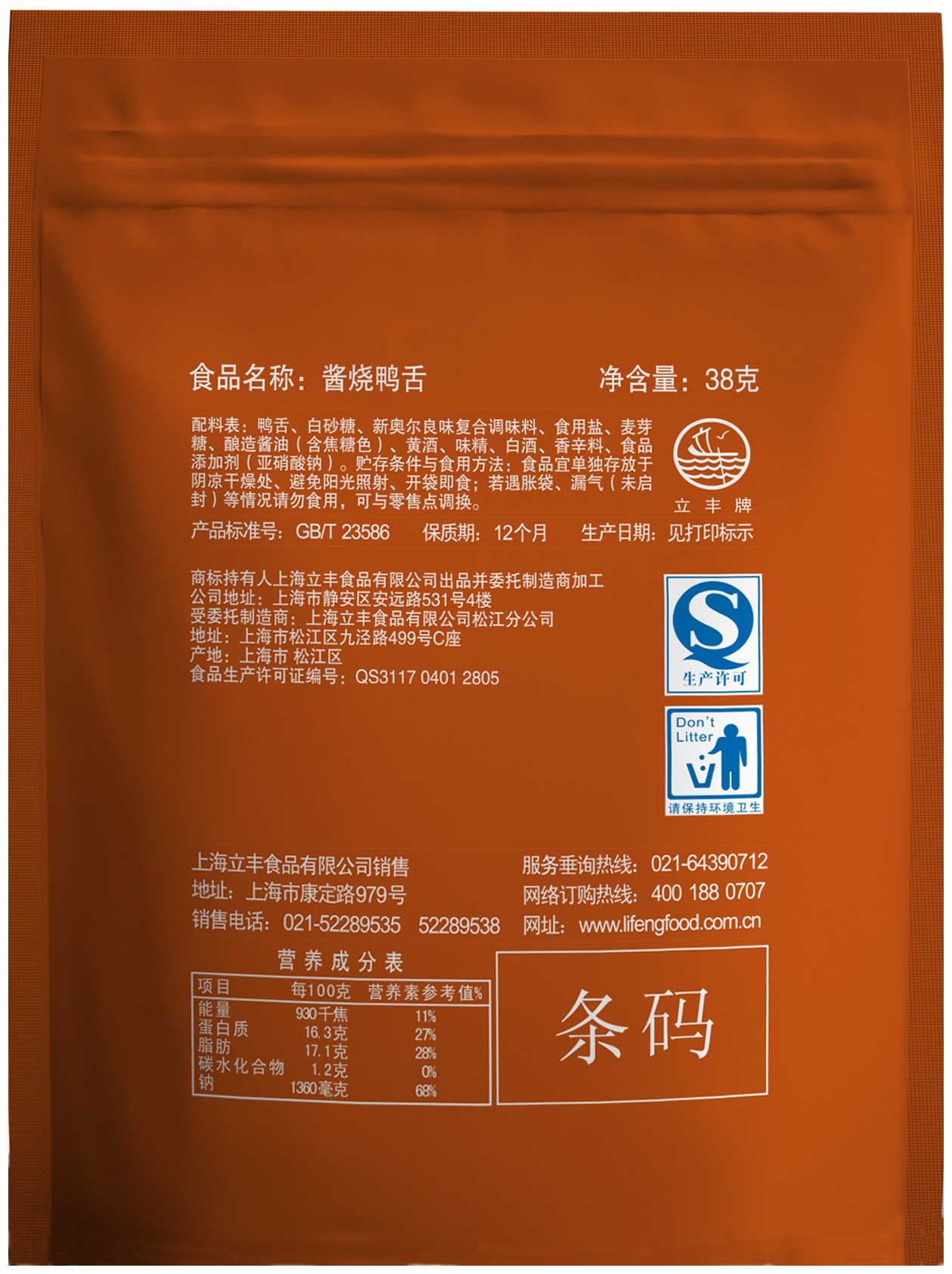 1.本外观设计产品的名称:包装袋(酱烧鸭舌)。2.本外观设计产品的用途:本外观设计产品用于食品包装。3.本外观设计产品的设计要点:在于产品的形状、图案及其结合。4.最能表明本外观设计设计要点的图片或照片:主视图。5.省略视图:其他视图无设计要点,故省略。