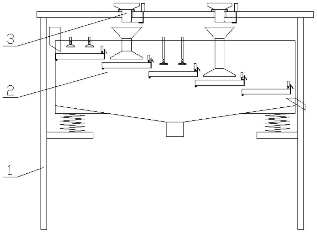 本实用新型公开了一种食品生产用瓜子仁裹粉装置,包括有支架,所述支架上设置有裹粉装置和至少一个定量投放装置,所述裹粉装置包括有裹粉箱和设置在裹粉箱的振动电机,所述裹粉箱两端分别设置有出料斗和进料斗,所述裹粉箱底部设置有若干个弹簧和出粉口,所述弹簧固定在支架上,所述裹粉箱顶部设置有至少一个与定量投放装置配合的投粉装置和若干个喷液装置,所述裹粉箱内设置有裹粉盒组,所述裹粉盒进料端设置在进料斗下方,所述裹粉盒组出料端设置在出料斗上方;本实用新型的一种食品生产用瓜子仁裹粉装置,其结构简单、方便实用通过多次上浆与裹粉,使得瓜子仁裹粉厚度得到控制,便于后续工序加工,同时降低粉料结团的现象。