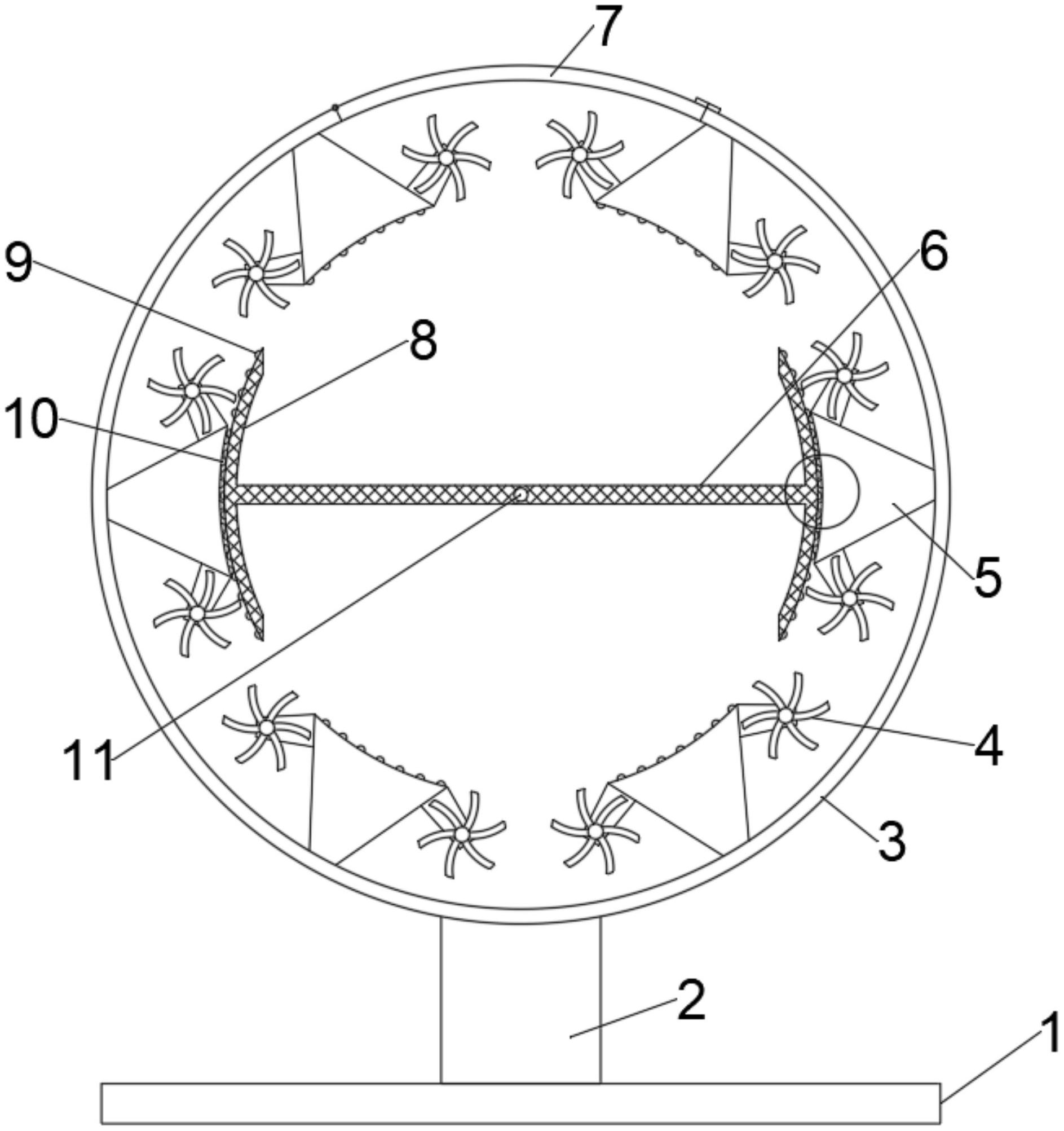 本实用新型适用于食品加工技术领域,提供了一种膨化休闲食品表面均匀裹料装置,包括:安装架;裹料单元,其安装于安装架上,包括转筒、放置网板和驱动组件;驱动组件用于分别带动转筒正反转以及带动放置网板正反摆动还包括有晃动组件,晃动组件包括底板、弹簧和重心机构,重心机构包括第四电机、内螺纹套、螺纹杆和偏心球,设有安装架和裹料单元,放置网板摆动发生倾斜时,其上的食品由较高的一端向另一端滚动,使得粉料充分、均匀包裹在食品表面,裹料效果更好,通过转筒的转动,将粉料提升至放置网板上方然后向下洒落,再次洒在食品上,可以反复充分利用粉料,避免造成浪费;设有晃动组件,使得食品运动充分均匀与粉料接触,提高裹料效果。