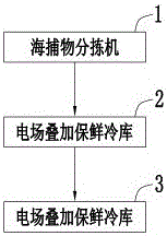 本实用新型公开了一种海捕物的船载保鲜设备,包括:包括依次设置的海捕物分拣机、液氮速冻设备、电场叠加保鲜冷库。本实用新型的海捕物分拣机、液氮速冻设备、电场叠加保鲜冷库构成一套相对简单且完整的海捕物的源头保鲜系统,可及时对海捕物进行分类、速冻和冷藏,尽量满足海捕物的保鲜要求,减少浪费,最大程度提高海洋渔获物的价格。