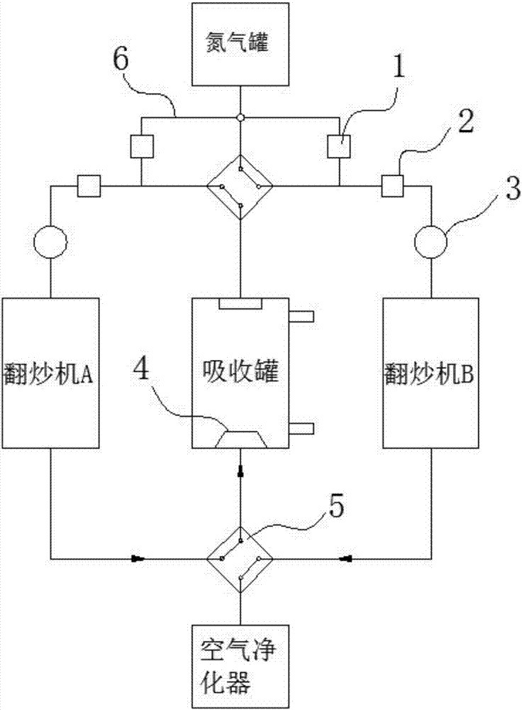 本实用新型公布了一种植物油风味物质的循环运输系统,它包括翻炒机,至少设置有两个翻炒机通过循环密封管道与吸收罐并联连接;所述翻炒机的进气端与氮气罐和吸收罐顶端的出气端之间通过阀门连接;所述翻炒机的出气端与空气净化器和吸收罐底端的进气端之间通过阀门连接;所述吸收罐底部的进气端设置有曝气机;所述循环密封管道上设置有循环气泵;所述氮气罐还通过支管与循环密封管道连通;所述支管上设置有补气电磁阀;所述吸收罐内设置有植物油。它能实现对植物油中持续的输入植物油风味物质,输入效率高,同时保证植物油风味物质的质量,极大的提高植物油的浓香程度。