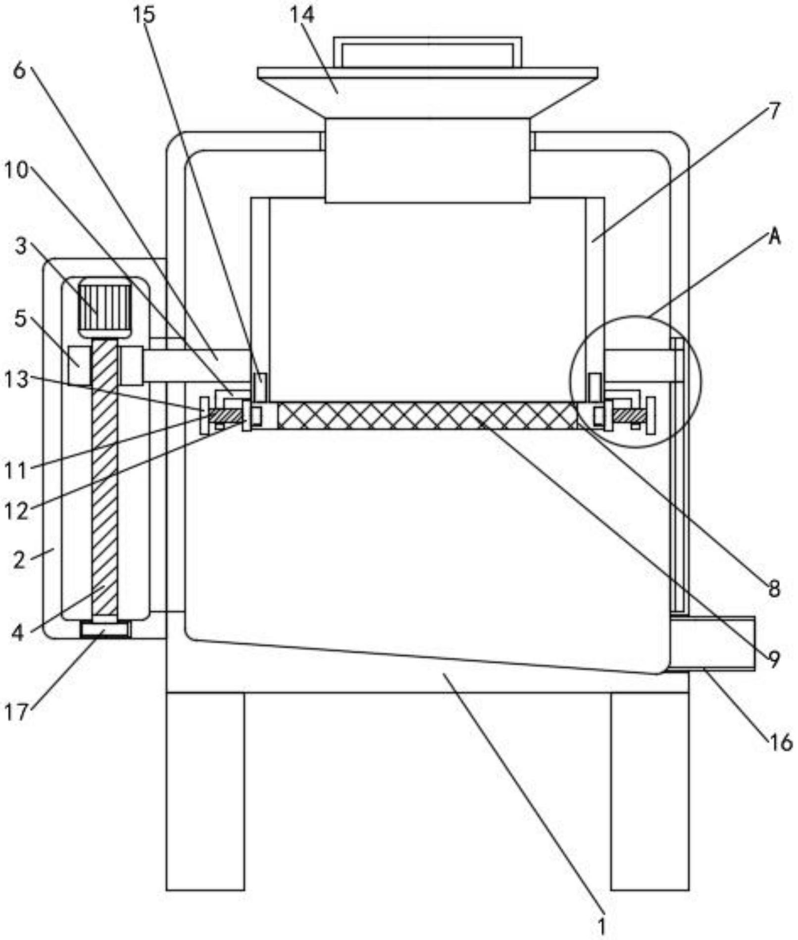 本实用新型涉及一种食用油生产加工的滤网清渣装置,包括过滤箱,所述过滤箱的左侧固定连接有驱动箱,所述驱动箱内侧的顶部固定连接有电动机,所述电动机的输出轴固定连接有螺纹杆,所述螺纹杆的外侧螺纹连接有螺纹块,所述螺纹块的右侧固定连接有活动方块,所述活动方块的右侧固定连接有固定框,所述固定框的底部活动连接有过滤方框,所述过滤方框的内侧固定连接有过滤网,所述固定框的左侧两侧均固定连接有固定螺架。该食用油生产加工的滤网清渣装置,整体结构简单,实现了滤网便于清渣的目的,避免滤网在对食用油原料进行过滤的过程中发生堵塞的现象,保证了滤网对食用油原料过滤的效果,提高低了滤网的使用效率和使用效果。