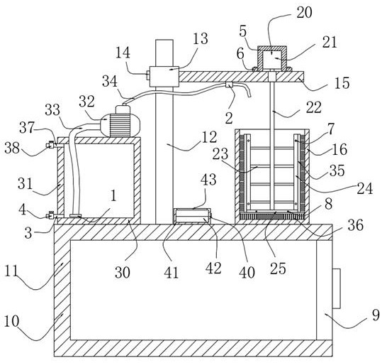 本实用新型提供了一种带有清洗功能的辣酱生产用定时搅拌装置,包括主体组件、搅拌组件、清洗组件和控制组件,所述主体组件包括第四壳体、支撑杆、套管、第三固定螺栓、支撑板和筒体;所述搅拌组件安装于所述主体组件的外侧壁,所述搅拌组件包括减速电机、传动杆、搅拌杆、第二壳体和第三壳体;所述清洗组件安装于所述主体组件和所述搅拌组件的外侧壁;本实用新型通过水泵、第一软管和第二软管的设置,可以抽取水箱内部的水源并注入到筒体的内部,通过启动减速电机,使得传动杆和搅拌杆旋转,从而使得第一板刷和第二板刷旋转,从而便于对筒体进行清洗。