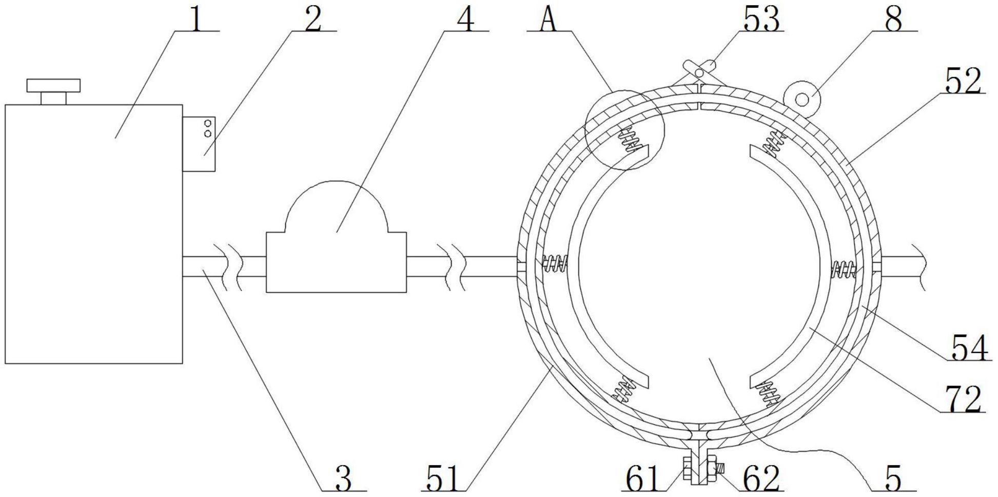 本实用新型涉及果树种植领域,尤其为一种适合密植矮砧苹果园的专属滴灌装置,包括水箱,所述水箱的外侧设有管道,所述管道的中端设有压力泵,所述管道的右侧设有固定装置,所述固定装置的底端设有滴管,本实用新型中,通过设置的左半环、右半环、固定片、液体管等,通过对螺栓进行旋拧,从而将螺栓与螺母分开,进而使得左半环和右半环以固定片为基点进行转动,打开固定装置的内部空间,打开后将内夹片贴紧树干,然后卡合,重新将螺栓与螺母结合,此过程中在弹簧的作用下内夹片将苹果树干夹紧,湿度检测器此时处于土壤中,滴管则围绕树干均匀分布,本装置安装简单且可以适用于所有密植矮砧苹果园,效果尤为突出。