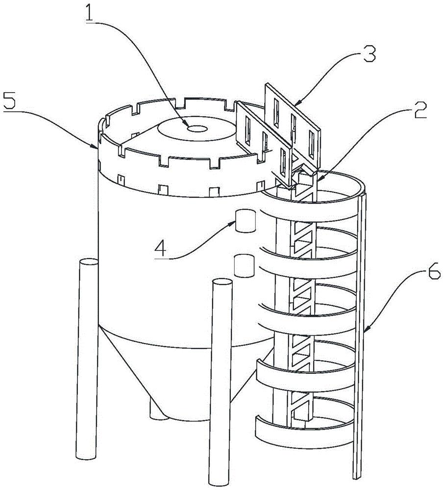 本实用新型实施例涉及料仓存储领域,提供一种料仓。在所述料仓的侧壁及顶部设置有爬梯,所述料仓还包括第一护栏及料位观察口;所述第一护栏设置于所述料仓顶部的所述爬梯的至少一侧;所述料位观察口开设于所述料仓的侧壁上。本实用新型实施例提供的料仓,通过在料仓的侧壁上开设料位观察口使得观察人员不必爬到料仓的顶部再对料仓内部的料位进行观察,极大的方便了观察人员对料仓内的料位进行观察,简化了观察人员的观察步骤。通过在料仓顶部的爬梯的至少一侧设置第一护栏,能够有效地保证观察人员的安全,提高了观察人员的安全性。此外,本实用新型实施例提供的料仓还具有结构简单、成本低等优点。