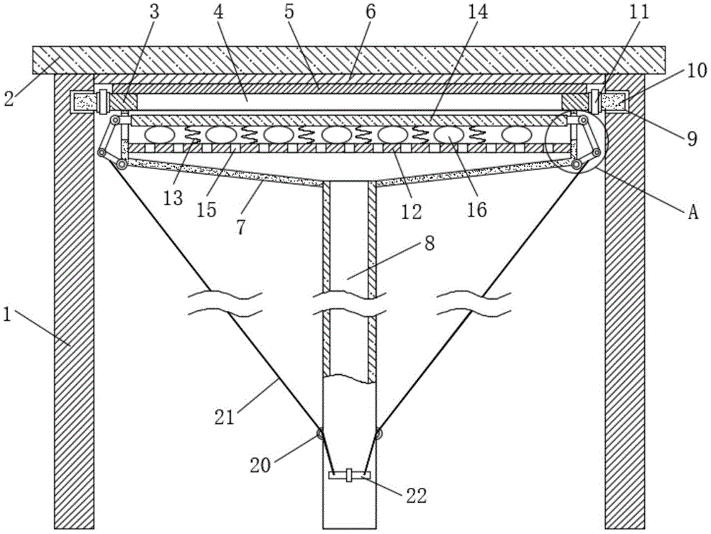 本实用新型公开了车间顶棚冷凝水刮板,包括车间本体,所述车间本体的上端固定连接有顶棚,所述顶棚的下方设有横板,所述横板通过设置在车间本体上的滑动机构实现位移动作,所述横板内设有引流槽,所述横板的上端固定连接有与引流槽位置对应的引流板,所述引流板远离横板的一端固定连接有刮板,所述横板的下端固定连接有蓄水池,所述蓄水池的下端固定连接有与其内部连通的导流管,所述导流管远离蓄水池的一端与地面相抵,所述蓄水池内水平设有隔板。本实用新型可以对水产加工车间的顶棚冷凝水进行吸收排除作业,操作简便,无须在潮湿环境下使用电力即可进行清除作业,有效避免冷凝水随意低落的现象。