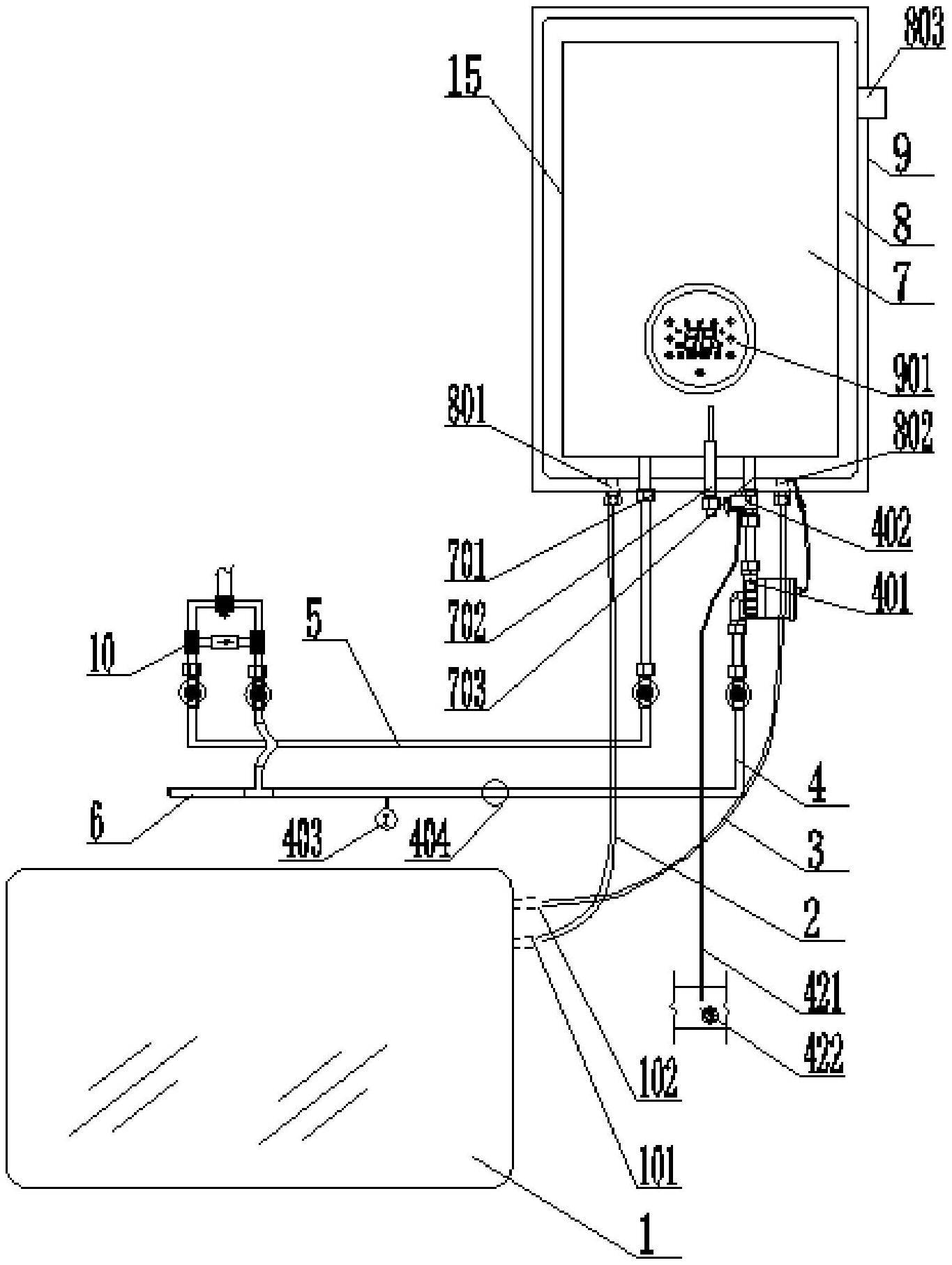 本实用新型是一种阳台壁挂式太阳能热水器,包括平板集热器和水箱,水箱上设有循环进口、循环出口、热水出口和冷水进口,循环进口和循环出口通过循环管路和平板集热器连通,热水出口连接有热水出水管路,冷水进口连接有回水管路,冷水进口和回水管路之间沿回水方向依次设有循环泵和单向安全阀,热水出水管路末端和回水管路末端通过H阀连通。控制器控制循环泵开启与H阀配合,将回水管路和热水出水管路中被冷却的均水吸入夹套式内胆的内胆内再次加热,水箱内的热水流至热水出水管路,减少管道内冷水的浪费,有效控制水温,节约资源,实现开即热的用水需求。满足不同年龄不同身高条件的限制,人工智能,便民普及,使用安全,灯环提升产品感官体验。