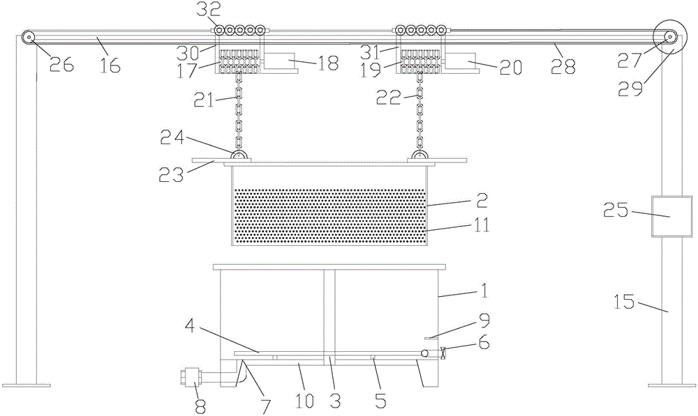 本实用新型提出一种自动分体式加热锅,外箱上端开口,底部设带加热孔的加热管,其通过加热控制阀与蒸汽发生设备连接;外箱底部设排水口和排水控制阀,内部设测温探头;内箱置于外箱内,其上端开口,其箱壁上设漏水孔和活动门,活动门与内内箱间由锁紧件锁紧;支撑架包括竖梁和横梁,横梁跨设于外箱上端,横梁上设移动吊轨和横向驱动装置;移动吊轨下方设第一转动轴、第一电机、第二转动轴和第二电机;第一转动轴上缠绕第一铰链,第二转动轴上缠绕第二铰链,第一铰链和第二铰链下端与内箱连接;加热控制阀、排水控制阀、测温探头、横向驱动装置、第一电机和第二电机与控制箱电连接。本实用新型不粘锅;自动控制温度;容量大;减少人工、缩短工时。