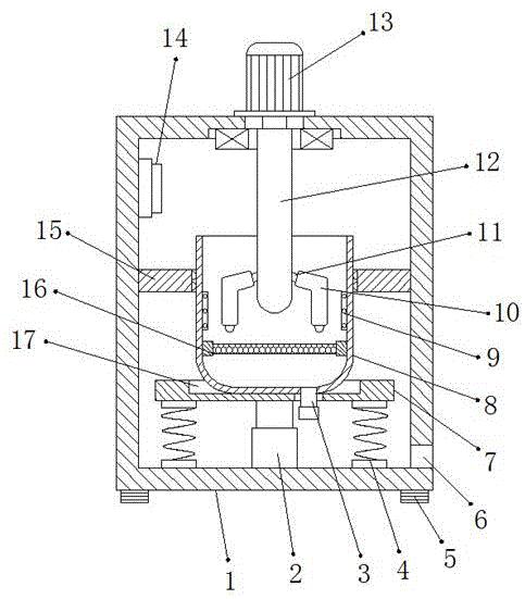 本实用新型公开了一种食品检测用消毒装置,包括消毒箱,所述消毒箱的底部内壁位于中间的位置固定有电动伸缩杆,且电动伸缩杆的顶部外壁固定有支撑板,所述支撑板的顶部外壁开有固定槽,且固定槽底部内壁的一侧开有通口,所述固定槽的底部内壁放置有消毒罐,且消毒罐底部外壁的一侧设置有排水管,所述消毒箱的顶部内壁通过轴承连接有转动杆,且转动杆的外壁靠近底部的位置固定有搅拌轴,所述搅拌轴的外壁套接有防护套。本实用新型能够防止搅拌轴与食品检测工具之间发生碰撞对检测工具造成损坏,防止搅拌时产生的晃动导致消毒罐与固定口之间发生碰撞对消毒罐的外壁造成损坏,能够防止消毒罐的内壁粘附有杂质对工具的消毒造成影响。