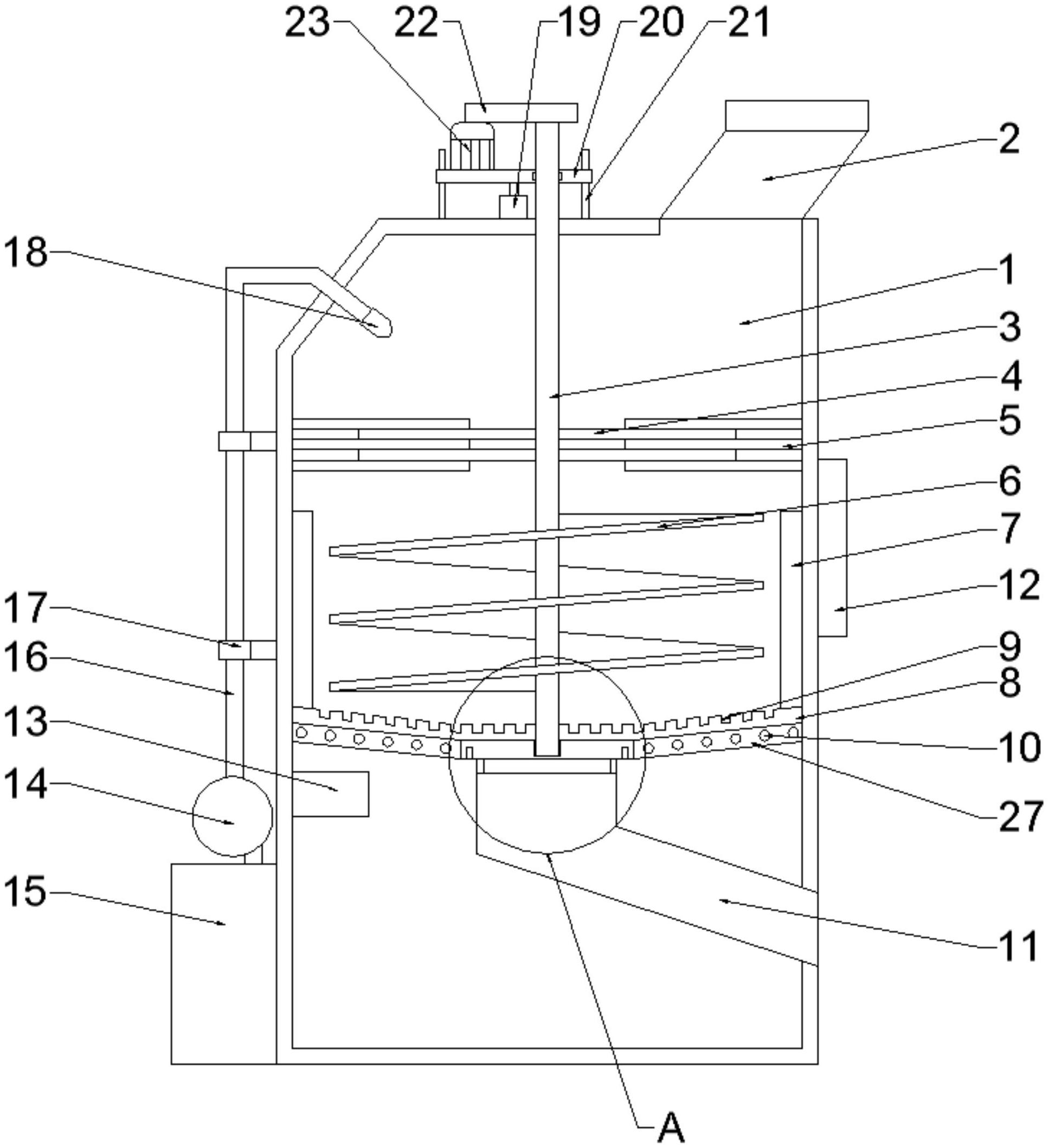 本实用新型公开了一种食品生产加工用原料粉碎搅拌装置,包括装置主体,所述装置主体顶部设有进料管,装置主体内转动连接有搅拌轴,装置主体内固定连接有定刀片,搅拌轴外固定连接有动刀片,动刀片和定刀片均设有若干个,搅拌轴外固定连接有搅拌叶,搅拌轴底部固定连接有底刮刀,底刮刀设有若干个,底刮刀上固定连接有侧刮刀,底刮刀内设有刮刀槽。本实用新型使用时,在粉碎和搅拌后对装置主体内部进行清洗,去除装置主体内壁附着的油污和食品残渣,避免其在下一次工作时与新的食品混合,提高产品质量;通过加热器和加热管之间的配合,在清洗过程中对水进行加热,使装置主体内壁升温,从而使内壁凝固的油污融化,便于刮除,提高清洁效果。
