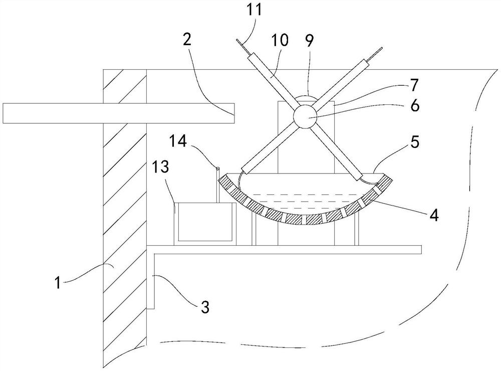 本实用新型公开了一种羊绒纱线生产废水处理装置,包括多个串联的废水池(1),第一级的废水池(1)的上方设有进水口(2),进水口(2)的下方设有绒毛过滤机构,所述绒毛过滤机构包括位于进水口(2)下方的支架(3),支架(3)与废水池(1)的侧壁固定,支架(3)上设有截面为圆弧形的过滤板(4),过滤板(4)上设有多个滤水孔,过滤板(4)的两端均设有挡水板(5),过滤板(4)的上方设有绒毛清理机构,绒毛清理机构的一侧设有绒毛储存机构。本实用新型具有不易堵塞的优点,降低了工人的劳动强度。