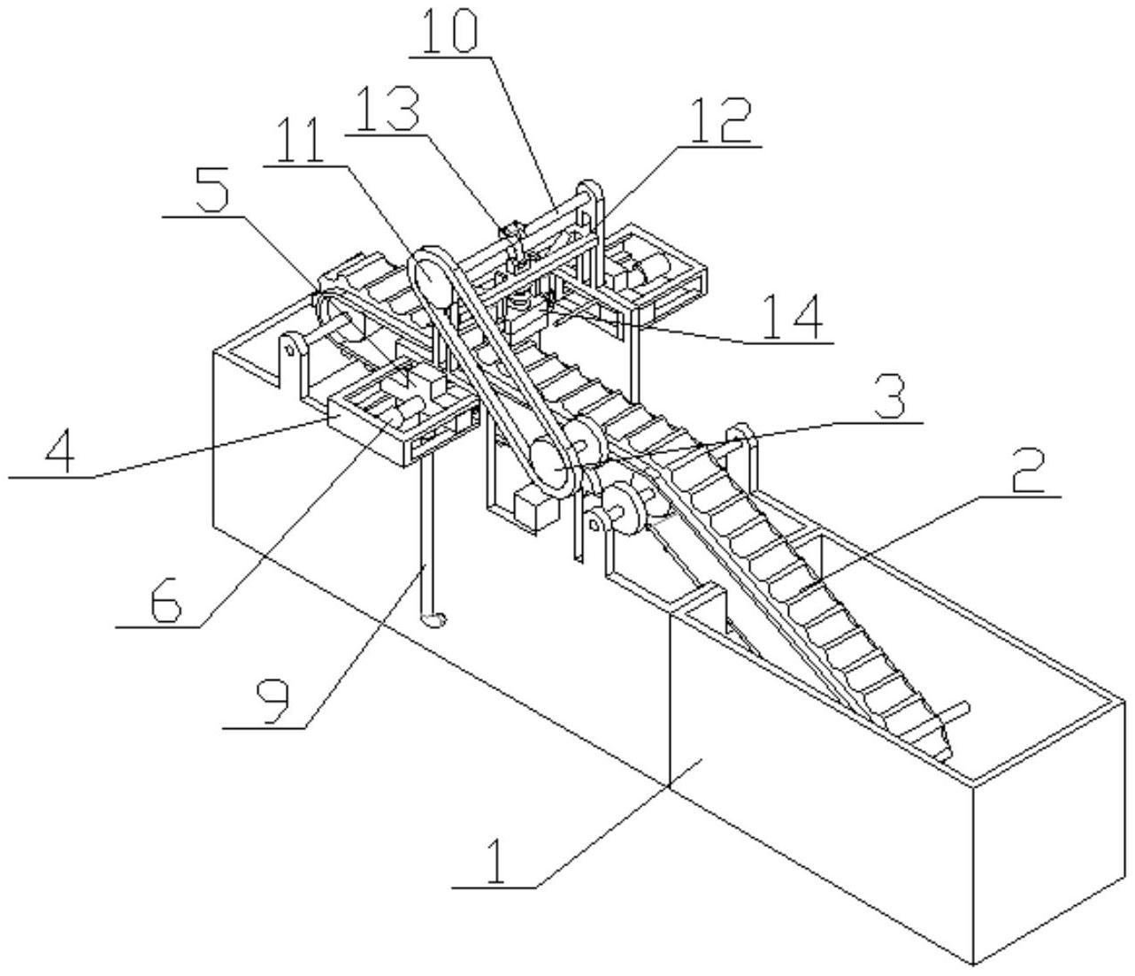 本实用新型公开了一种新鲜莲子自动去芯装置,包括去芯箱体、连接在所述去芯箱体中部的输送机构和动力机构、固定连接在所述去芯箱体两侧的支撑架、滑动连接在所述去芯箱体上部的第二滑架及转动连接在所述去芯箱体顶部的曲轴,所述支撑架上滑动连接有第一滑架,所述第二滑架上滑动连接有第三滑动架,所述曲轴的一端固定连接有第一带轮,所述第一带轮与所述动力机构之间传动连接;该装置可以对任意大小的莲子进行固定,防止在去芯的过程中在外力的作用下使莲子掉落,通过将去芯管设置为空心管,并与水管连通,这样的设置可以在插入莲子取芯时,同时向莲子内部注水,这样可以在水的作用下通过给莲子芯一个推力,从而达到一个更好的去芯效果。