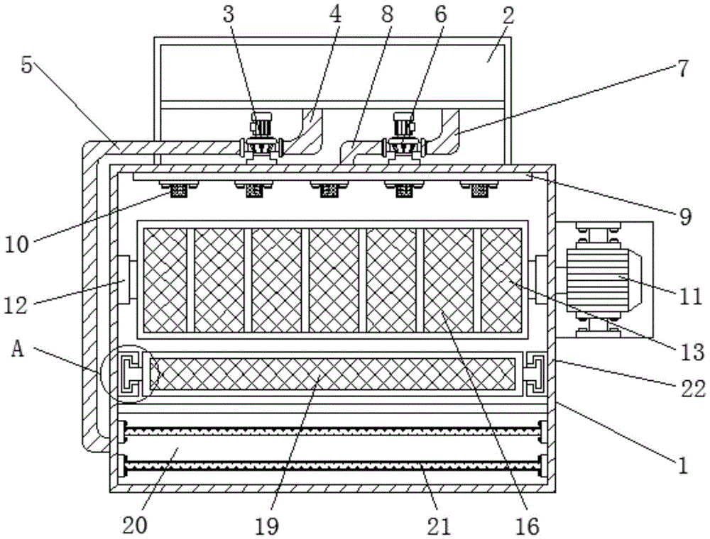 本实用新型公开了一种具有干燥功能的果脯加工用水果清洗装置,包括箱体,所述箱体的外侧上方设置有蓄水箱,且蓄水箱的内侧下方设置有第一加压水泵,所述第一加压水泵的一侧设置有第一出水管,且第一加压水泵的另一侧设置有第一进水管,所述蓄水箱的内侧下方设置有第二加压水泵,且第二加压水泵的一侧设置有第二进水管,所述第二加压水泵的另一侧设置有第二出水管,所述箱体的内侧顶端设置有安装架,且安装架的外侧下方均设置有喷头。该具有干燥功能的果脯加工用水果清洗装置,通过电加热板,可以对清洗完成后的,进行高温烘干减少了加工步骤,从而提高了该装置的工作效率,同时也提高了该装置的实用性。