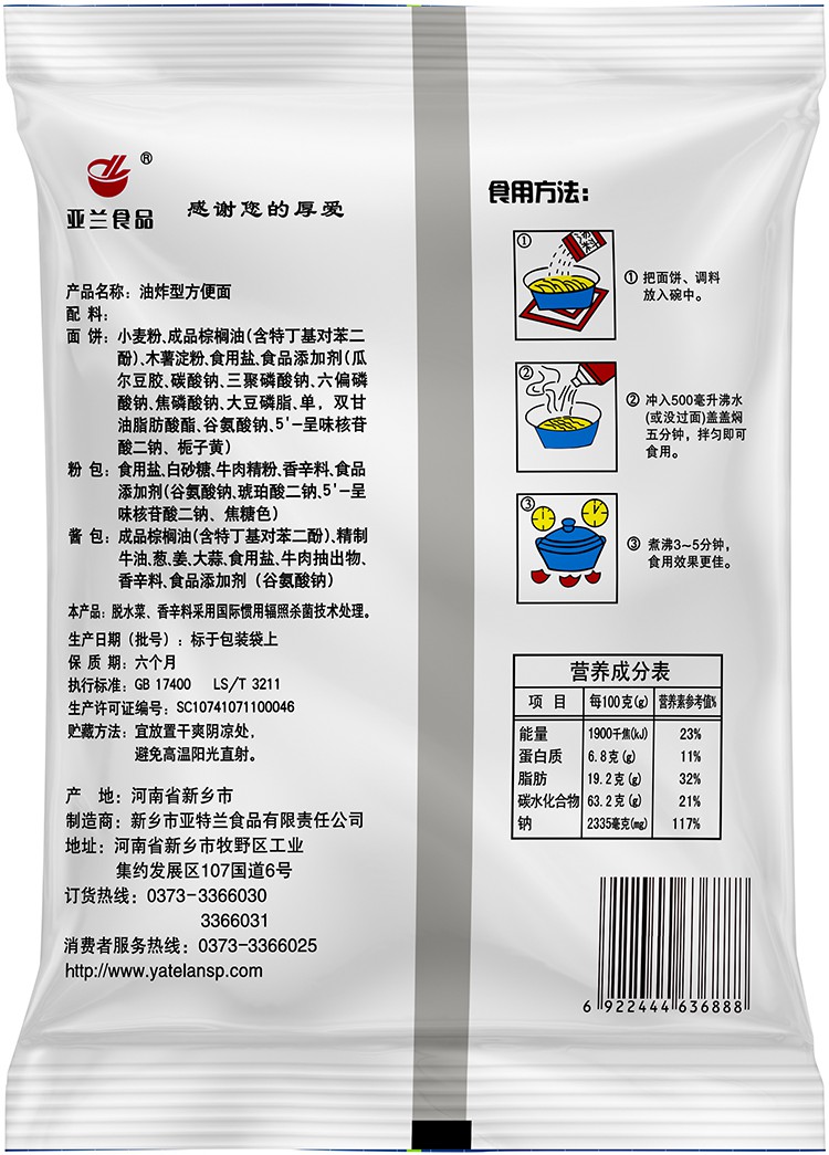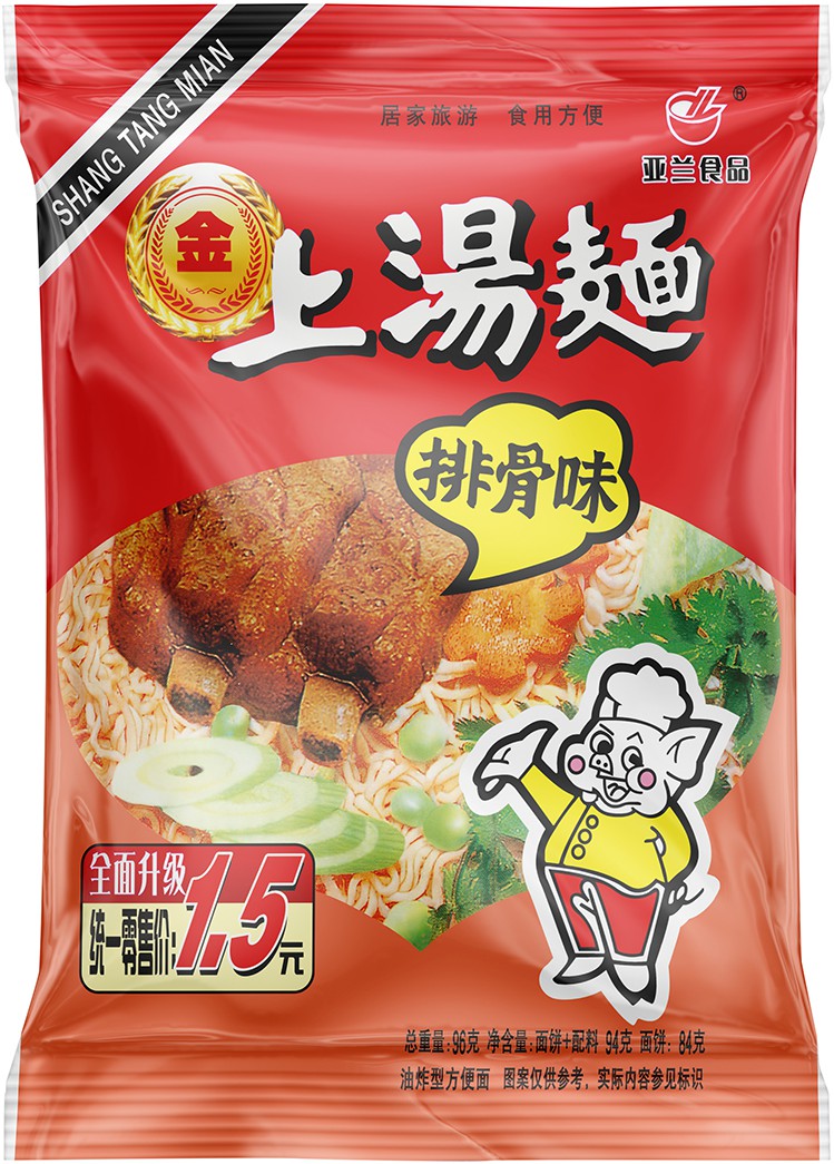 1.本外观设计产品的名称:包装袋(亚兰食品 上汤排骨面)。2.本外观设计产品的用途:用作包装袋。3.本外观设计产品的设计要点:在于形状与图案的结合。4.最能表明设计要点的图片或照片:主视图。5.本外观设计产品为薄型产品,省略左视图 右视图 俯视图 仰视图。