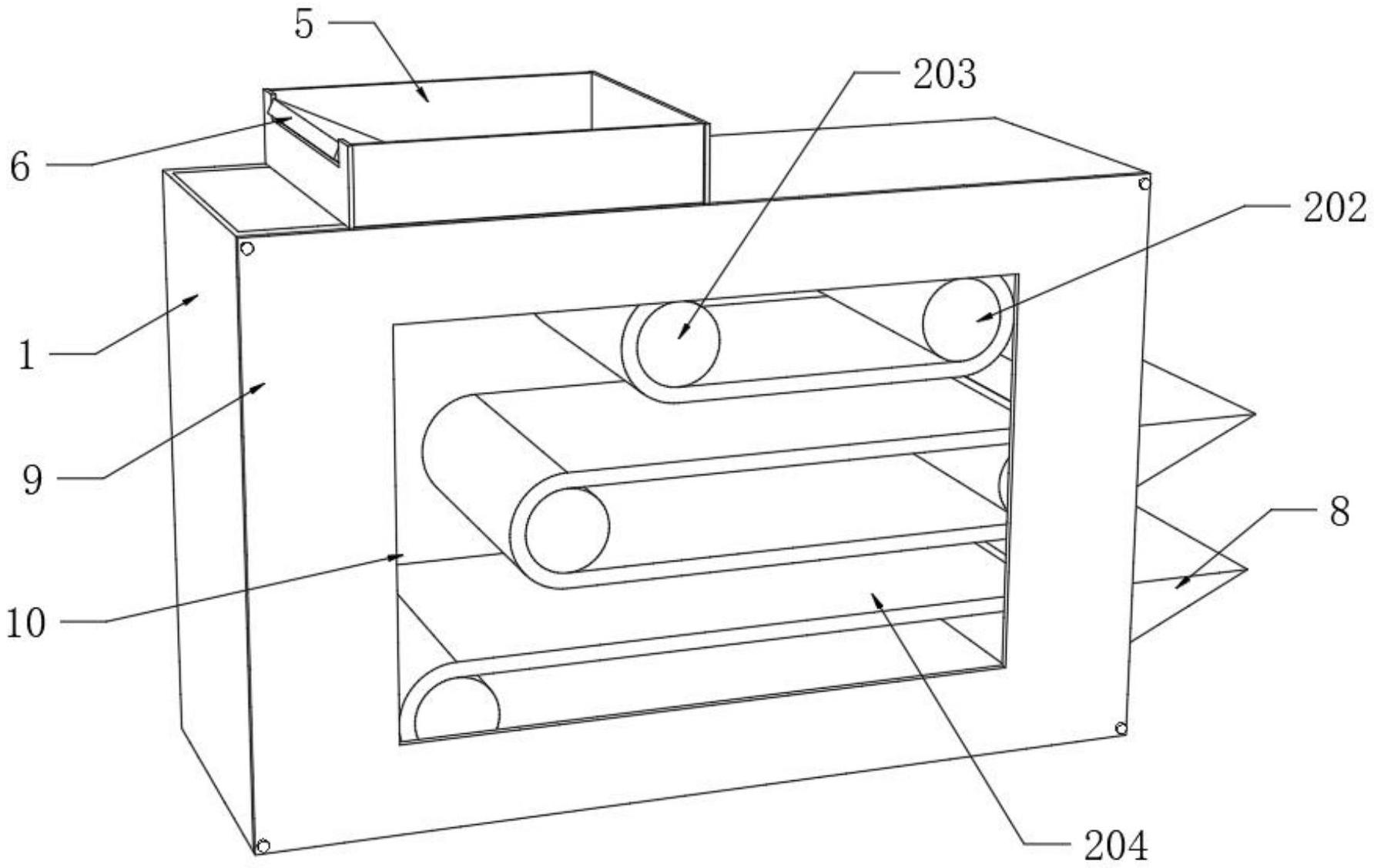 本实用新型公开了一种阻挡装置,包括箱体和转向机构,所述箱体的上表面开设有斜槽,所述斜槽的一侧开设有进料口,所述斜槽的上表面固定连接有阻挡板,所述阻挡板的一侧转动连接有斜向铝质不粘板,所述箱体靠上的一侧活动连接有转向机构。该实用新型通过转向机构和斜向铝质不粘板的设置,斜向铝质不粘板能够使面条从垂直下落的方向转到斜向输送到传送辊上,启动电机带动传送辊转动,传送辊带动一侧的转动杆转动从而将面条传送到中部转向机构的传送辊上,中部的转向机构与靠上的转向机构的运行方向一致,从而中部的转向机构带动传送辊上表面的面条向支撑台一侧移动到烘干架上烘干,通过设置转向机构达到面条自动转向分流的目的。