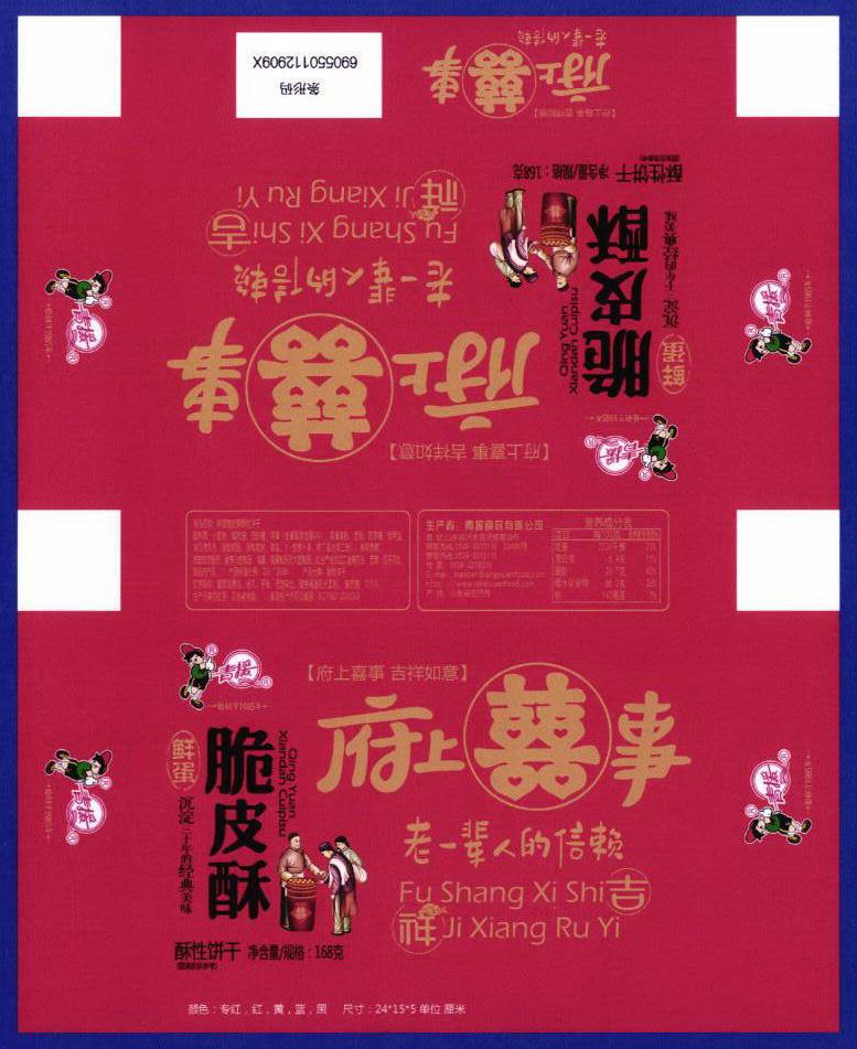 1、本外观设计产品的名称:包装纸(府上喜事)。2、本外观设计产品用于食品包装。3、本外观设计产品的设计要点:在于产品图案。4、最能表明本外观设计要点的图片或照片:主视图。5、本外观设计产品为平面产品,其它视图无设计要点,故省略。