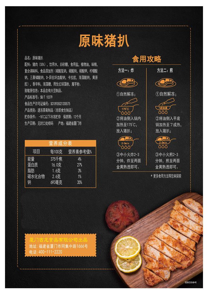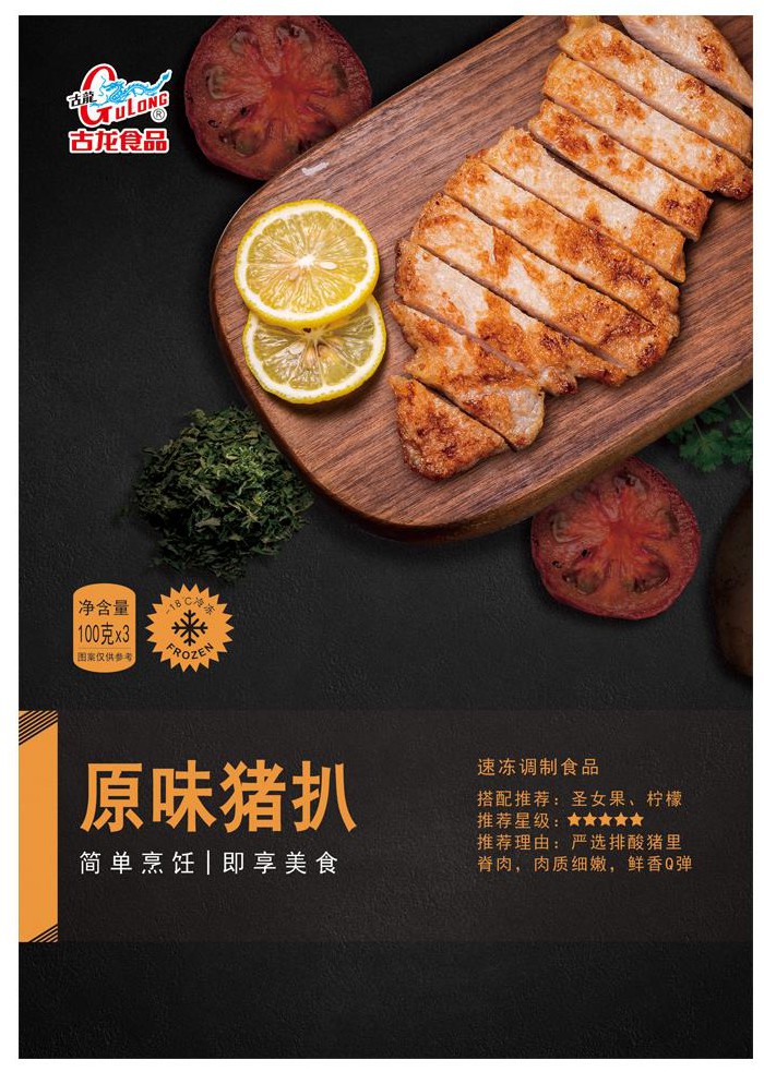 1.本外观设计产品的名称:包装袋(原味猪扒)。2.本外观设计产品的用途:用于包装食品。3.本外观设计产品的设计要点:在于图案。4.最能表明设计要点的图片或照片:主视图。5.本外观设计产品为薄型产品,省略左视图、右视图、俯视图、仰视图。
