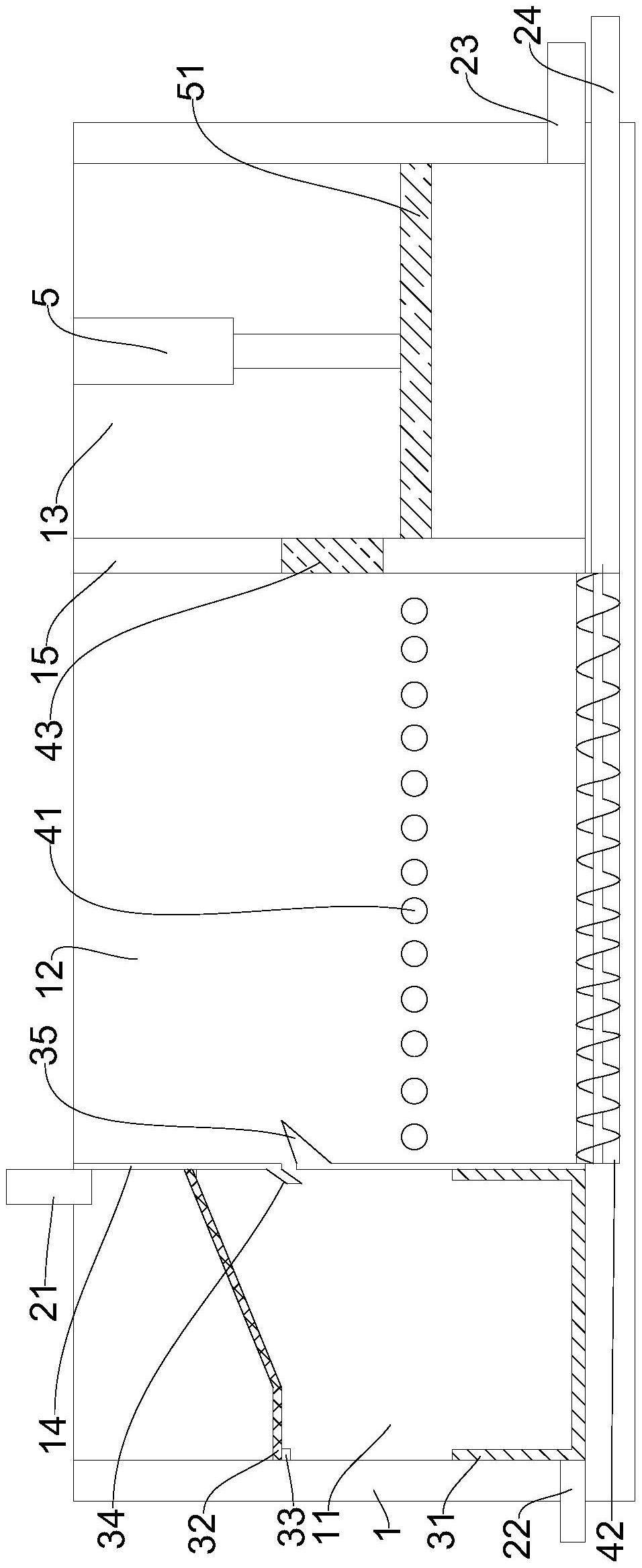 本实用新型公开了一种胶原蛋白改性羊绒加工废水回收装置,包括箱体,箱体内分隔成粗滤室、凝结室和回收室;粗滤室上部设有倾斜滤板,倾斜滤板底部设有过滤槽;凝结室内设有多根入药管,底部呈梯形收口并设有绞龙输送机;回收室顶部竖直设有伸缩杆,伸缩杆底部连接有过滤网兜;一号隔离板和二号隔离板上设有开槽;粗滤室顶部设有进水管,粗滤室底部一侧设有排污管,回收室底部一侧设有回水管,箱体底部设有与绞龙输送机相连的排泥管。本实用新型通过将箱体内部分隔成粗滤室、凝结室和回收室,经过多道处理的废水能完全除去含有的固体杂质和有害的化学成分变成可回收利用的回收水,回收水再从回水管进行回收利用,节约水资源。