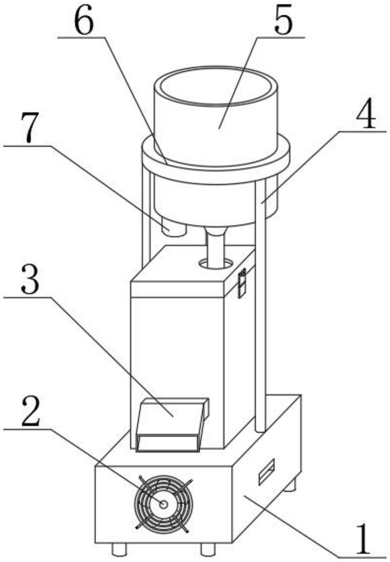 本实用新型涉及大蒜脱皮技术领域,尤其为一种新鲜大蒜脱皮的装置,包括脱皮装置、支撑架和储料外壳,所述脱皮装置上端面通过支撑架和固定环板与储料外壳固定连接在一起,所述储料外壳中间固定连接有固定圆板,所述固定圆板开设有第一出料孔,所述固定圆板下端面滑动连接有移动板,所述移动板内侧固定连接有电动伸缩杆,所述电动伸缩杆底端和储料外壳内壁固定连接在一起,本实用新型中,通过设置的储料外壳、电动伸缩杆、固定圆板和移动板,使得装置可以在实际的使用过程中不间断的向脱皮装置内部投放大蒜进行脱皮,以解决原有装置需要人工的向脱皮装置内部投放大蒜造成人力投入的问题。