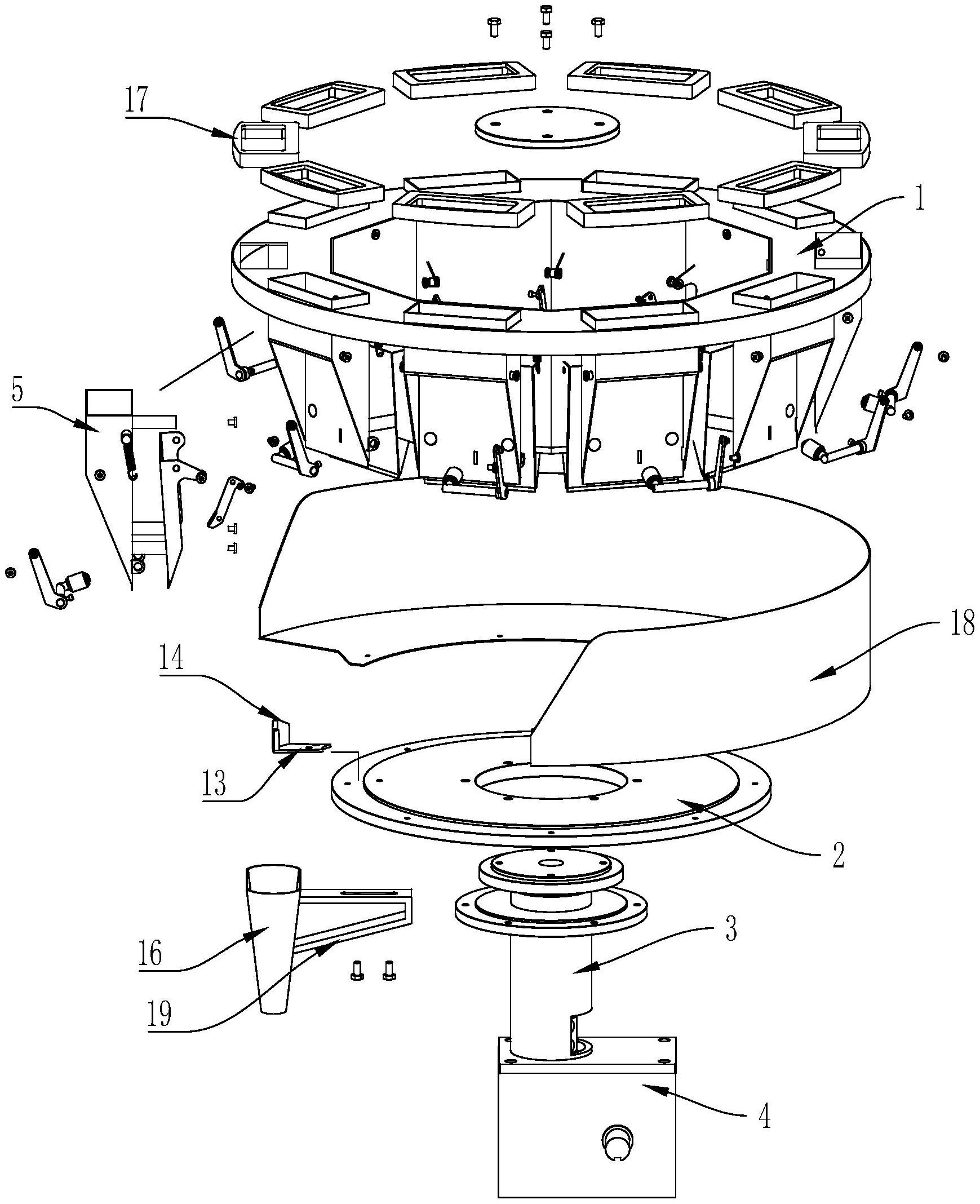 本实用新型公开了一种包装机多物料混合投料器,包括料仓和固定底盘,料仓为筒状且在外侧壁均匀设置有量杯,量杯包括上端开口的量斗和用于固定量斗的多条支撑杆,量斗的下端外侧设置有斜开口,斜开口覆盖有向外转动打开的侧盖,侧盖的顶部与量斗的侧壁转动连接,且侧盖的顶部设置有一体的摆臂,摆臂的外端通过从动杆与主动臂的摆动端转动连接,主动臂的转动端固定在量斗下端内侧的摆动转轴的一端,摆动转轴贯穿量斗下端内侧的轴承座,摆动转轴的另一端设置有摆动轴,开盖凸轮的外侧设置有用于推动摆动轴向上转动的斜面结构。本实用新型投料下料灵活,投料效果更好适用性更强。