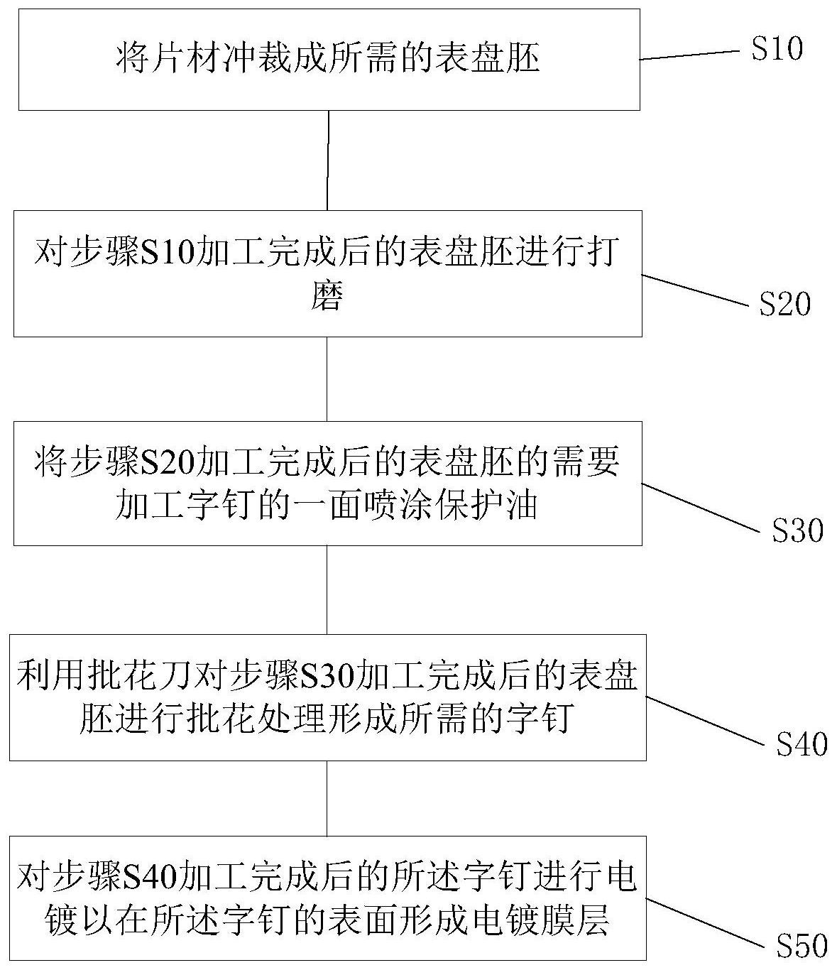 本发明涉及钟表技术领域,提供了一种表盘字钉的制造方法、表盘及手表,包括以下步骤:A、将片材冲裁成所需的表盘胚;B、对步骤A加工完成后的所述表盘胚进行打磨;C、将步骤B加工完成后的表盘胚的需要加工字钉的一面喷涂保护油;D、利用批花刀对步骤C加工完成后的表盘胚进行批花处理形成所需的字钉。本发明提供的表盘字钉的制造方法、表盘及手表,通过利用批花刀对表盘胚进行批花处理形成所需的字钉,不仅能够增强字钉的立体效果以及整体视觉效果,提高表盘的档次,且由于字钉与表盘是一体连接的,不存在字钉容易脱落的问题,有效解决了现有技术中的表盘字钉没有立体感、容易脱落的技术问题。