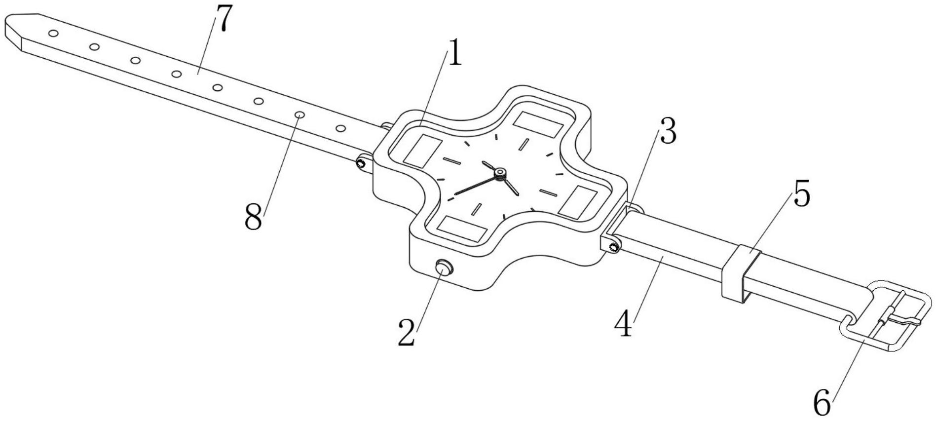 本实用新型公开了一种手表按钮防水结构,包括手表本体,所述手表本体的前端中部穿插固定连接有防水机构,所述手表本体的左端中部和右端中部均固定连接有连接机构,右侧所述连接机构的外表面右部穿插固定连接有第一表带,所述第一表带的外表面中部穿插活动连接有表带扣,所述第一表带的外表面右部穿插活动连接有卡孔锁,左侧所述连接机构的外表面左部穿插固定连接有第二表带,所述第二表带的上端中部开有若干个固定孔。本实用新型所述的一种手表按钮防水结构,通过设置防水机构和按钮本体,提高了按钮的防水性能,延长手表的使用寿命,通过设置连接机构,便于对表带进行拆卸更换,提高实用性,适合广泛使用。