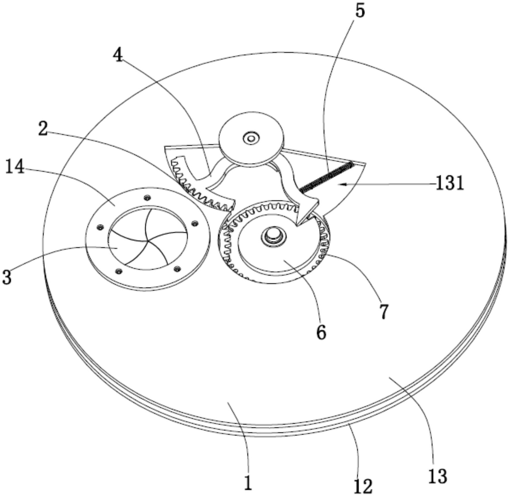 本申请提供了一种开合结构及手表,该开合结构包括:安装盘、啮合机构、多个叶片、摆动件和弹性件,安装盘设于手表的机芯上,安装盘的中心设有通孔,通孔处设有凸轮,凸轮与机芯上的时轮固定连接并与时轮同步转动,摆动件通过弹性件与凸轮的外周面相抵接并随凸轮的转动而摆动,摆动件与啮合机构啮合连接,啮合机构驱动各叶片转动以使多个叶片相互聚拢或相互分散。当叶片顺时针转动时,各叶片分散,当各叶片逆时针转动时,各叶片聚拢,各叶片在聚拢和分散过程中呈现出不同的图案,而且叶片的表面也可以设计不同的图案,使得该开合结构能显示不同的图案,保证该手表的美观性,提高了手表的档次。