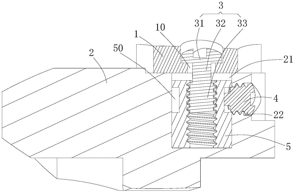 本实用新型提供了一种螺钉调整结构,包括第一装配件、第二装配件和螺钉,第一装配件开设有第一连接孔,第二装配件开设有第二连接孔,第二连接孔内设有套筒,螺钉穿过第一连接孔并与套筒螺纹连接,螺钉调整结构还包括用于固定套筒的锁紧件,第二装配件开设有第三连接孔,锁紧件用于穿过第三连接孔并抵接于套筒的外壁。而且,可在螺钉上设置卡簧或者在第一装配件设置变形部以防止螺钉掉落。本实用新型提供的螺钉调整结构,卡簧或者变形部的设置可以防止螺钉脱落,在需要调整螺钉头部的朝向时,松开锁紧件,旋转螺钉,螺钉带动套筒旋转,螺钉调整至所需的方向后,再使用锁紧件锁紧套筒,以实现对螺钉头部方向的调整。