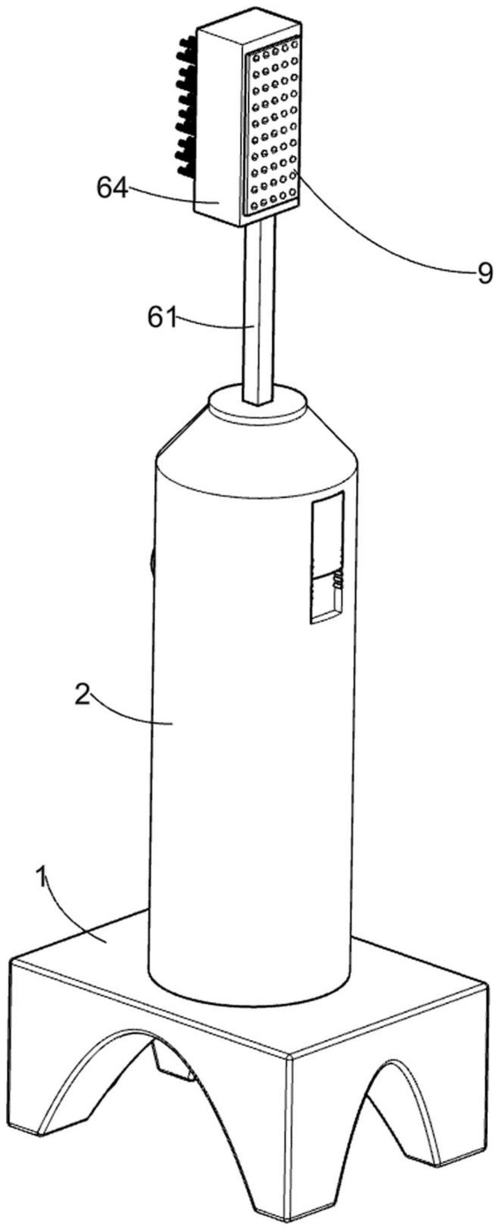 本发明涉及一种智能电动牙刷,尤其涉及一种能对牙齿进行多角度刷拭的智能电动牙刷,包括有底座、硅胶外壳、蓄水组件、驱动组件、调节组件等;底座上卡套式连接有硅胶外壳,蓄水组件设置在硅胶外壳上,驱动组件设置在硅胶外壳内壁,硅胶外壳上设置有调节组件。通过开槽圆盘与压缩弹簧的作用,带动推动杆及开口活动框上下往复运动,开口活动框带动开口箱及其上装置上下往复运动,毛刷板上下往复运动对牙齿表面进行刷拭,实现调整毛刷板刷拭位置,达到将牙齿表面刷拭干净的目的。