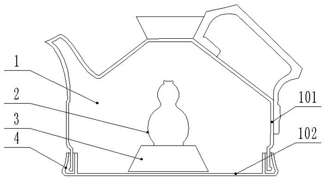 本实用新型公开了一种气动力水平旋转茶壶,包括壶体,壶体包括壶嘴和把手,壶体底壁上开设有进水口,壶体的底壁固定连接有聚气盘,进水口位于聚气盘内,聚气盘顶部设有通水口和排水口,排水口位于壶嘴一侧;聚气盘顶部转动连接有旋转壳体,聚气盘与旋转壳体通过通水口连通;旋转壳体的水平横截面为圆形,旋转壳体的侧壁上开设有多个均匀布置的出气孔,旋转壳体的内侧壁上水平固定连接有与出气孔一样数量的直线气道,直线气道的一端与旋转壳体内腔相通,另一端与出气孔连通,多个直线气道周向均匀布置。旋转壳体内的气体通过直线气道排出,排出时产生的反冲力使旋转壳体反向旋转,增加产品的把玩性、观赏性和收藏价值。