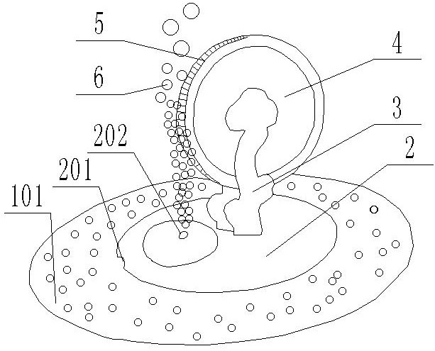 本实用新型公开了一种气动力旋转茶壶,包括壶体,还包括聚气盘,所述聚气盘的中部向上突起,通过边缘与壶体内侧底壁固定连接;聚气盘的顶部开设有排气孔,底部侧边开设有排水孔;聚气盘上方垂直转动连接有圆形的摆件,摆件的边缘周向均匀固定连接有推动板,排气孔排出的气泡向上移动与推动板碰撞使摆件旋转。本实用新型将加热过程中产生的气泡通过聚气盘收集后通过排气孔排出,气泡上升过程中推动摆件边缘的推动板,使其不断旋转。本实用新型没有使用额外的能量,通过利用烧水时的气动力使摆件转动,开创茶具和气动力与传统文化直观结合,增加产品的把玩性、观赏性和收藏价值。
