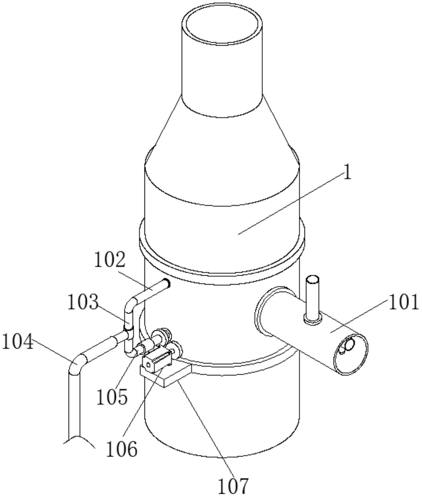 本实用新型公开了一种高效节能脱硫脱硝除尘系统,包括依次用管路连接的脱硫装置、除尘装置和脱硝装置,脱硫装置底部与进烟气管连接,脱硝装置内部的喷淋管与外部的氨水罐连接,脱硝装置的塔体中部外壁贯通固定安装有进气管,塔体的中部另一侧外壁分别安装有主喷淋管和副喷淋管,主喷淋管和副喷淋管一端通过三通接头连接安装,通过设置的齿轮A、齿轮B、副喷淋管,在使用时由于副喷淋管通过密封旋转接头与三通接头的底部转动连接,因此驱动电机通过齿轮A和齿轮B,可以带动副喷淋管实现转动,较传统结构相比,该装置可以调整浆液的喷洒效果,提高脱硝效果。