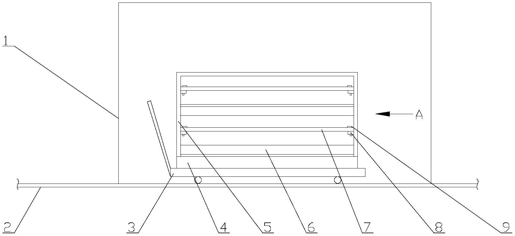 本实用新型具体涉及一种钢化玻璃器皿均质处理装置,包括均质炉、轨道和小车,其特征在于小车的台面上设有框形支架,框形支架从上下向下依次设置水平的器皿放置架和倾斜的溜板,相邻的两个溜板倾斜方向相反,分别指向小车的两侧,小车左右两侧底部设有废料收集槽,器皿放置架为方形框架结构,其内部设有多个产品托环,相邻托环之间、托环和相邻的边框之间通过连接杆连接,整个器皿放置架为镂空筛网结构。本实用新型具有结构合理、使用方便、提高工作效率的优点。