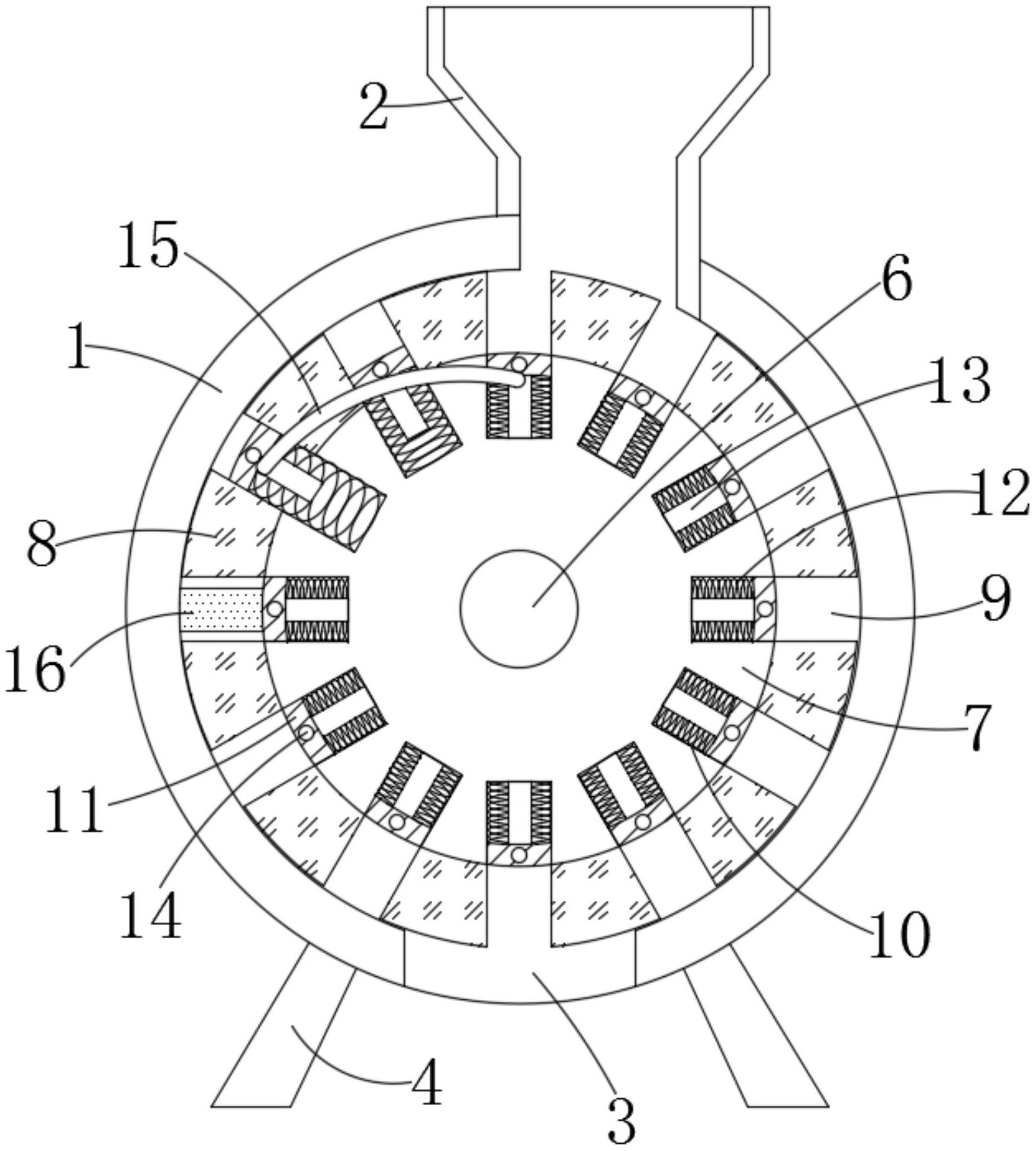 本实用新型公开了一种竹纤维原料分离用压碎装置,包括机体,所述机体内设有压碎腔,所述机体的顶端设有进料斗,所述机体的底端设有下料口,所述机体的底侧壁上对称固定连接有四个支撑柱,所述机体的一侧壁上固定连接有马达电机,所述马达电机的输出端上固定连接有贯穿机体的转轴,所述转轴上固定连接有压碎辊,所述压碎辊位于压碎腔内,所述压碎辊的外侧壁上对称固定连接有多组挡片。本实用新型能够对放入进料斗内的竹子进行自动化压碎处理,显著的提高了竹子压碎作业的效率,并且切割出的竹片大小均匀,满足了造纸时竹纤维分离过程对竹片大小均匀的要求。