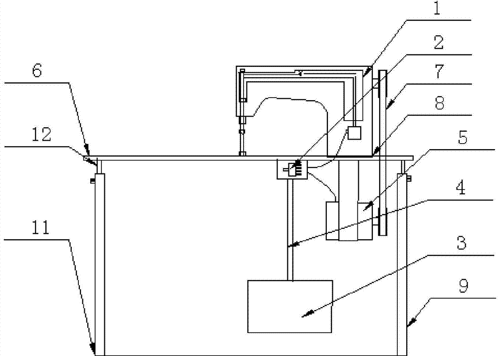 缝纫机,它涉及纺织设备技术领域,它包含机头、控制开关、踏板、拉杆、电机、操作面板、传送带、接头、撑杆、卡槽,所述电机与控制开关连接,电机通过传送带与机头的主轴连接,控制开关与机头连接,踏板通过拉杆与控制开关连接,所述操作面板与数根撑杆固定连接,机头上设置有接头,操作面板上设置有卡槽,机头通过卡槽与操作面板连接,所述撑杆由杆一和杆二套接而成,所述踏板起翘角度为10°~20°。本实用新型既方便随时拆卸和安装,又适合安装各种机头,同时减低了操作者的疲劳度和提高了生产效率。