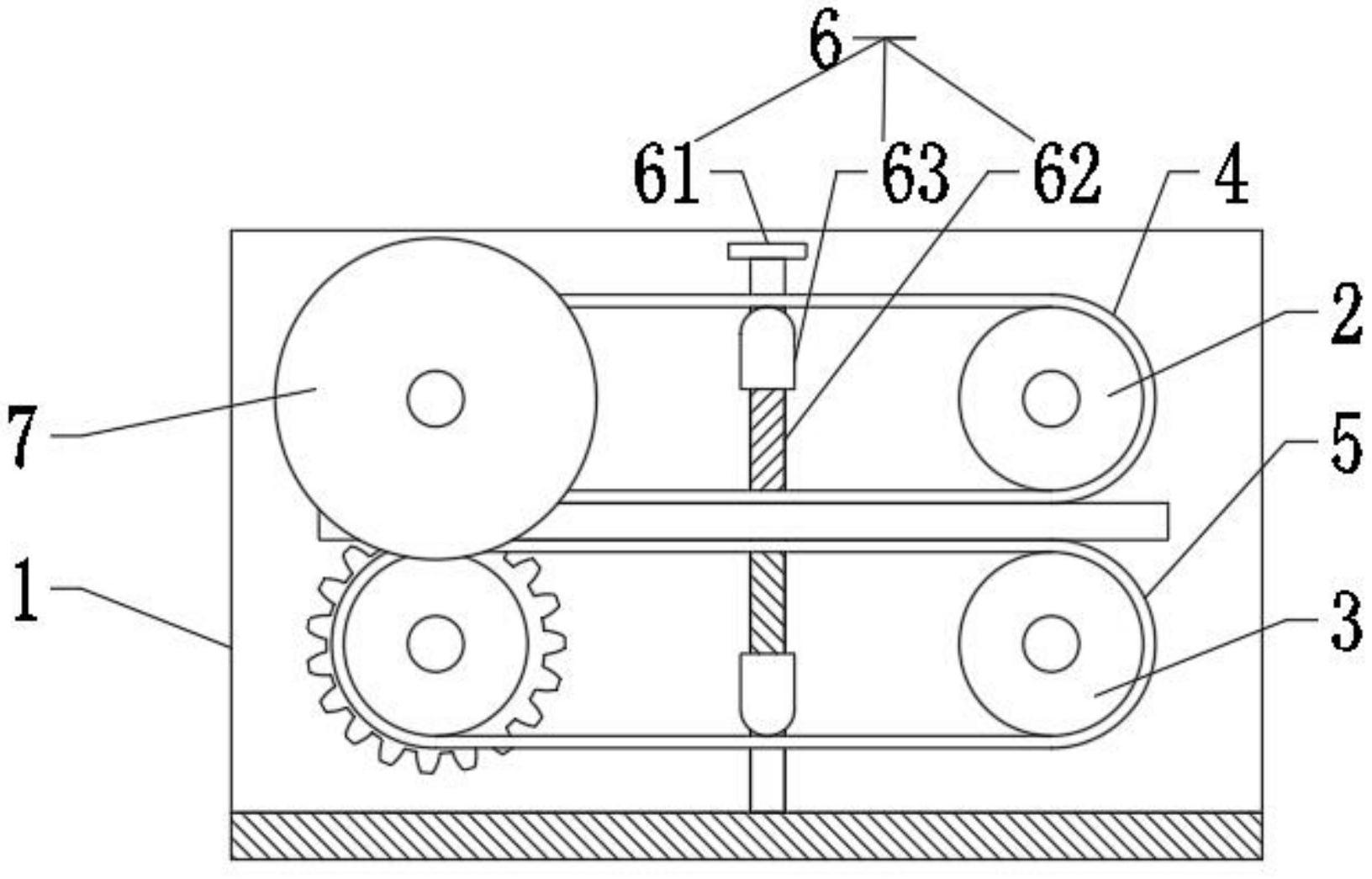 本实用新型适用于地毯切边技术领域,提供了一种地毯切边机,包括:本体,所述本体连接有驱动组件,所述驱动组件活动连接有从动组件,所述驱动组件活动连接有同步带一,所述从动组件活动连接有同步带二;切割刀片,所述切割刀片与所述驱动组件活动连接;驱动组件带动同步带一旋转的同时驱动从动组件,从动组件带动同步带二旋转,同步带一配合同步带二带动地毯直线移动,并且驱动组件驱动切割刀片同步切割地毯,所述调节组件用于调节同步带一和同步带二的松紧程度,保证同步带一和同步带二与地毯之间的摩擦力,具有高效和切割质量好的优点。