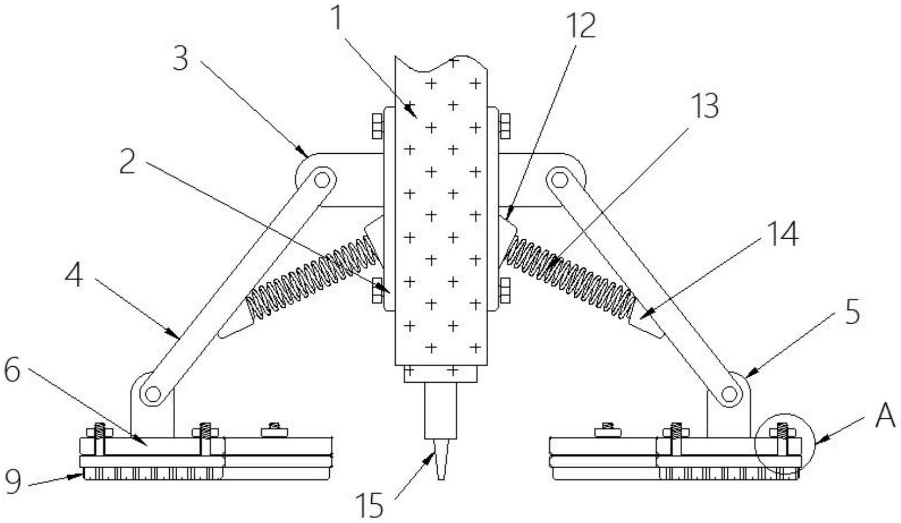 本实用新型公开了一种便于清洁的手工枪刺地毯机器人压布盘,包括:刺枪机器人主体,所述刺枪机器人主体的外端面固定连接有安装板,且安装板的外端面固定连接有第一安装块,所述第一安装块的外端连接有压杆;第一连接板,其固定连接在第二安装块的下端,所述第一连接板的内部开设有衔接孔,所述第二连接板的下端固定连接有刷毛;第一固定块,其固定连接在安装板的外端面并设置在第一安装块的下方,所述第一固定块的外端固定连接有连接弹簧。该便于清洁的手工枪刺地毯机器人压布盘,方便对毯面进行清理,且便于拆卸更换清理组件,同时解决了现有的手工枪刺地毯压布盘对地毯的压平效果较差的问题。