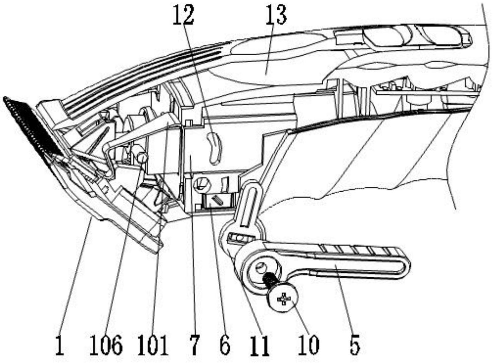 本实用新型公开了一种电推剪刀距侧面调节装置,属于美容美发护理电器技术领域,其中包括机身本体,所述机身本体左侧固定连接有头盖,所述头盖侧面设置有刀头组合,所述机身本体侧面固定连接有档位盒,所述档位盒侧面设置有传动件,所述传动件侧面设置有调节键,所述机身本体侧面设置有推杆,所述头盖表面开设有轨道槽,所述轨道槽内设置有轨道凸块,所述调节键与轨道槽相抵接,所述头盖下端设置有机身上盖,其有益效果是,调节键上下扭动时带动传动件一起旋转,档位齿扭动从而带动档位扣子做上下运动,档位扣子上下运动时能够与卡盒下盖碰撞产生清脆悦耳的档位声,能够使人们感知到是否滑到位,同时也起到了档位自锁功能。