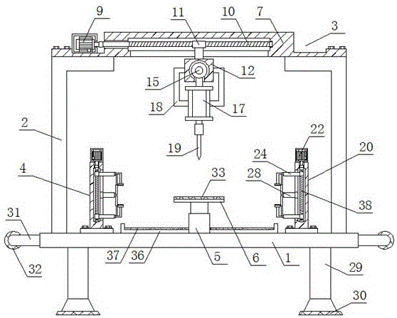 本实用新型公开了一种转椅扶手台面仿形气动冲切装置,包括加工台,所述加工台上表面对称焊接有两组支撑架,所述支撑架上通过第一螺栓固定有驱动组件,所述加工台上表面通过第二螺栓对称固定有两组固定组件,所述加工台上表面中部焊接有第一电动推杆,所述电动推杆的活塞杆顶端焊接有放置板,本装置内的固定组件在满足任意规格板材的固定要求的同时,还减少了本身与板材的接触面积,降低了对冲切操作的影响,而在第一电机和第二电机的组合使用的情况下,通过气缸活塞杆伸出带动切刀升降,使得切刀可在矩形范围内任意点移动,便于完成任意线条的切割需求,达到仿形冲切的目的,提高了加工效率。
