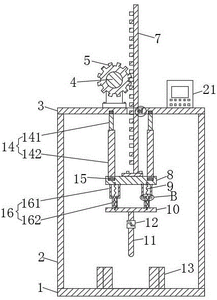 本实用新型公开了一种转椅扶手内撑杆强度检测装置,包括矩形底板,顶板的顶部通过螺栓安装有电机,电机的输出轴的外部套装有环形齿轮,顶板的中部开设有矩形孔,矩形孔的内部设有矩形齿轮条,环形齿轮与矩形齿轮条啮合;矩形齿轮条底部通过螺栓安装有第一圆盘,第一圆盘的下端面和第二圆盘的上端面之间焊接有弹簧,第二圆盘的下端面的中部焊接有圆杆,圆杆上安装有压力传感器,压力传感器的输出端与显示屏的输入端电性连接;矩形底板的上端面的左右两侧均焊接有竖板;本方案,方便直观的检测出扶手内撑杆的强度,防止压力传感器的受到的压力瞬间飙升,有效的防止压力传感器的损害,提高了压力传感器的使用寿命。