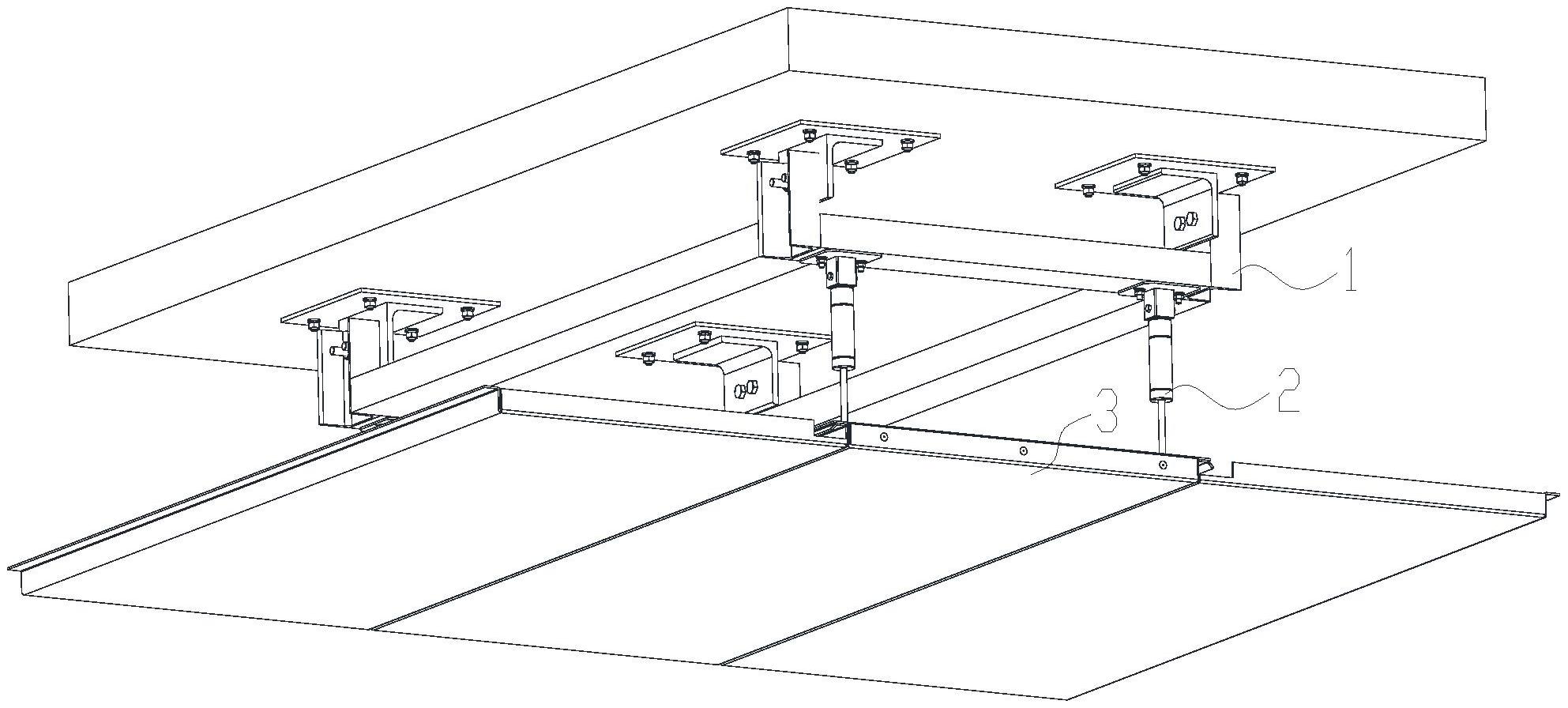 本实用新型要解决的技术问题是提供一种铝合金吊顶天花系统隐藏式检修口结构,包括悬挂龙骨系统、伸缩杆系统和检修口吊顶铝板系统。悬挂龙骨系统由槽钢与角钢焊接而成的安装在混泥土墙顶上的特定框架结构,用来吊挂整个检修口系统;伸缩杆系统由四根安装在悬挂龙骨系统上的气动阻尼杆构成,实现检修口吊顶铝板的拆装;检修口吊顶铝板系统是由氟碳喷涂铝单板及背筋组框型材铆接而成的单元板块,实现墙顶的装饰及对顶部管道、线路的检修功能;本实用新型采用钢材焊接成龙骨系统并以气动阻尼杆连接吊顶铝板系统以实现吊顶板的拆装,整个吊顶系统具有顶部空间检修功能,且隐藏式检修口结构不会破坏装饰效果的一致性。