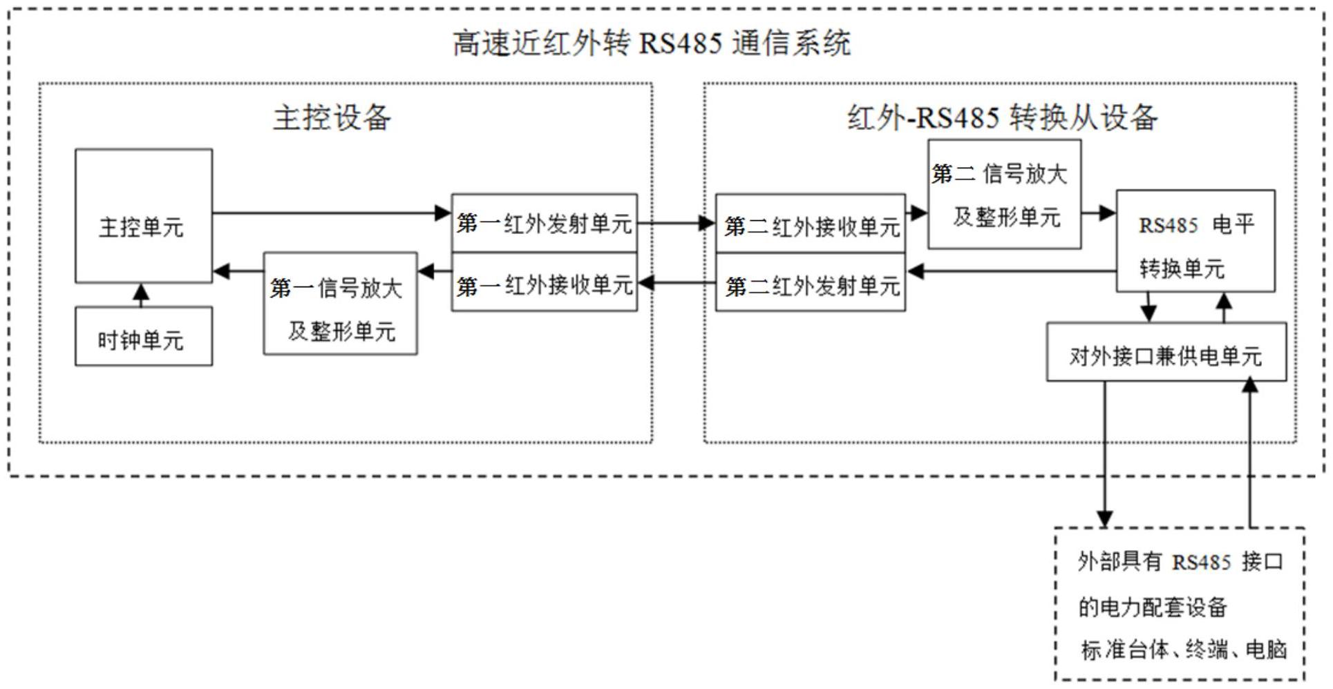 一种高速近红外转RS485通信系统,该系统包括主控设备和红外‑RS485转换从设备,所述主控设备与红外‑RS485转换从设备之间通过近红外通信方式进行无线通讯,所述的红外‑RS485转换从设备与外部具有RS485接口的电力配套设备相连。本实用新型在保证电表结构满足IP54的情况下,实现了近红外通信与RS485的转换,并且将近红外通信速率提高到921.6KHz,无需额外的定时器等电路来单独控制RS485接口芯片的收发,以低成本电路实现红外信号与RS485信号的同步转换,便于客户操作,更安全且成本更具优势。