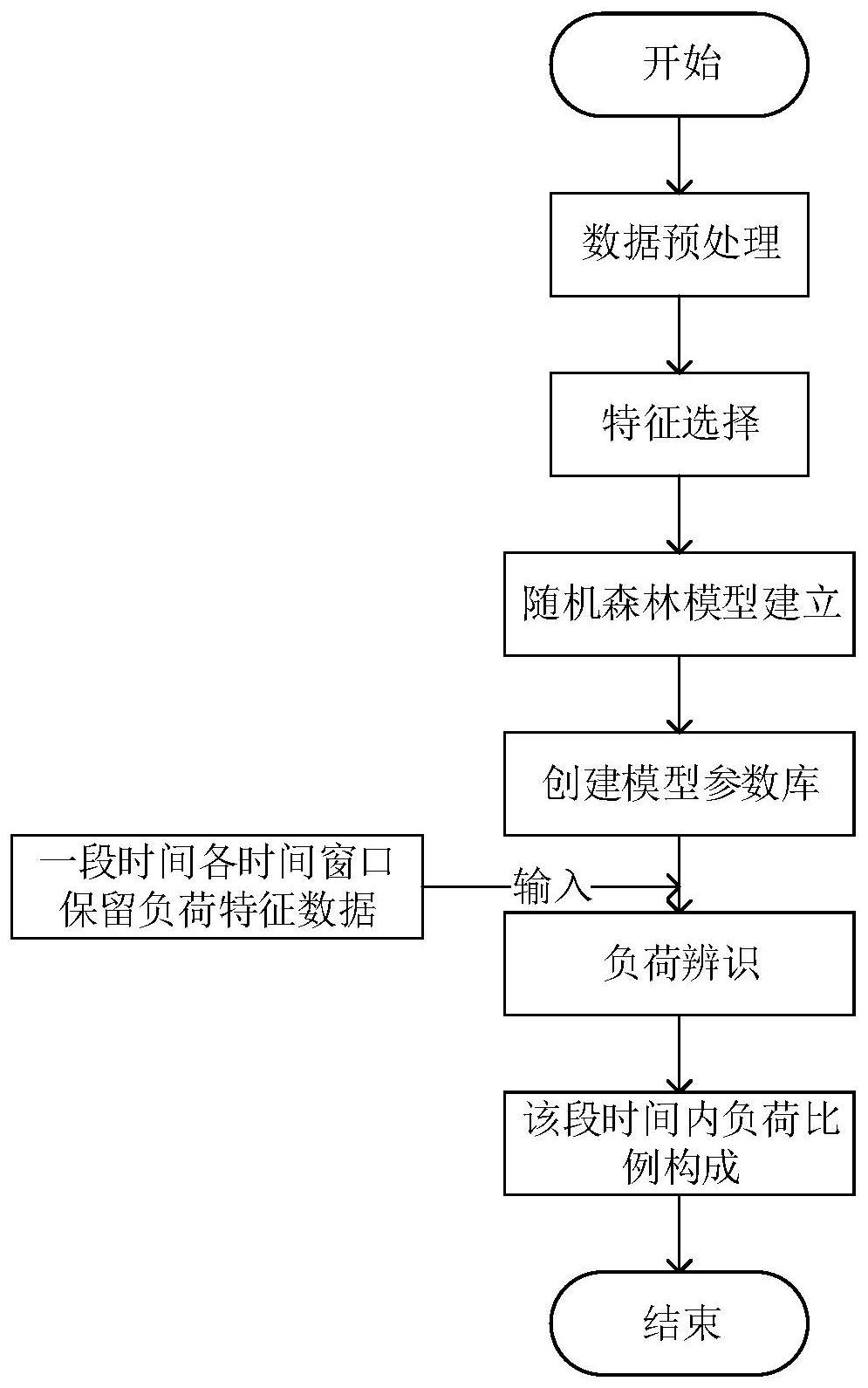 一种基于数据挖掘技术的非侵入式负荷辨识方法以及装置,该方法包括以下步骤:获取负荷特征的样本数据集;进行预处理操作;对预处理后的样本数据集进行特征选择,重新组建样本数据集;基于重新组建的样本数据集以CART树为弱分类器建立随机森林模型,并保留各CART树的划分属性及其属性值来形成模型参数库;对于需要分析的一段时间电压电流的波形数据,根据模型参数库进行负荷辨识,得到该段时间内负荷比例构成情况。本发明使用数据预处理、特征选择、随机森林模型等数据挖掘技术充分对电网末端各时间点负荷进行辨识,能够精确得出一段时间内的负荷比例构成,能够对电网未来供电和工厂大设备电器的能效管理提供参考。