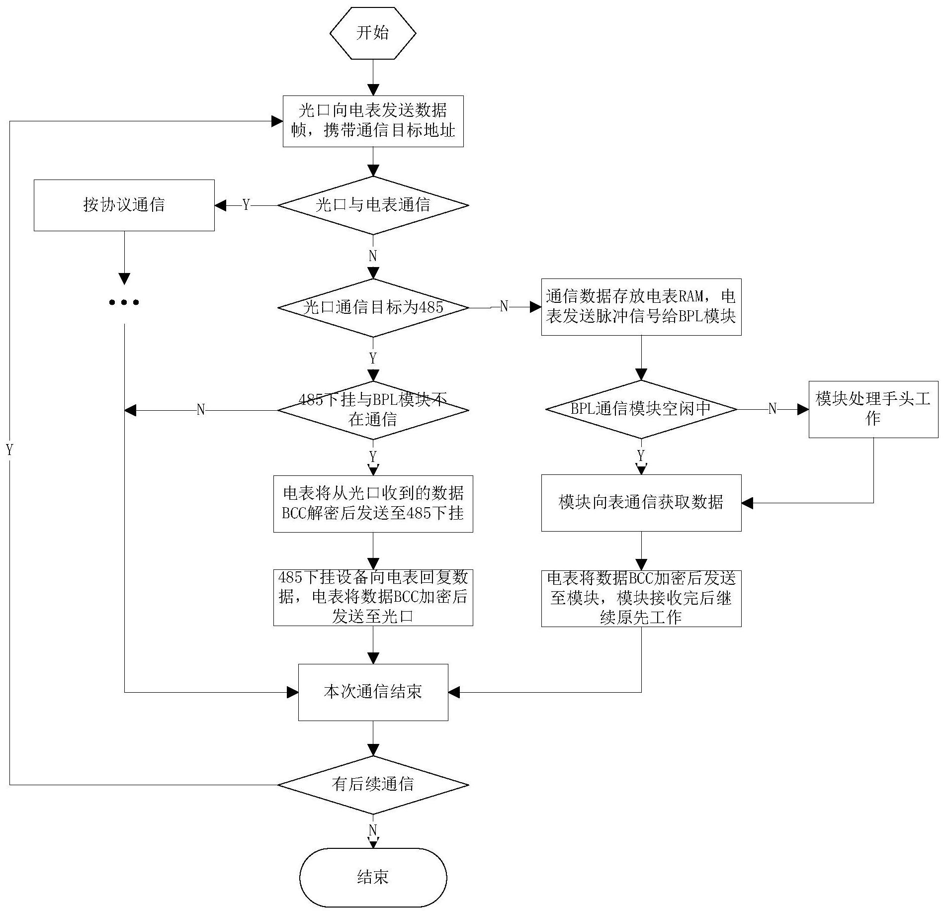本发明提供一种基于电表实现多设备分时通信的方法,所述的电表下挂若干个设备,所述设备的通信单元采用BPL载波模块、485通信模块、PLC载波通信模块、GPRS通信模块或者RF通信模块;外部红外通信设备通过电表向通信对象发送通信模块串口请求帧;通信对象收到脉冲信号后,根据当前进程进行任务安排,如果当前正在繁忙,继续执行当前任务,直到空闲;通信对象处理完从电表端接收的数据后,结束空闲状态,执行其他任务。本发明的电能表多设备分时通信,实现解决了电能表下挂设备之间通信冲突等问题,提升了现场解决问题的效率以及通信数据的可靠性;可以用于所有带多个通信串口的电子产品,降低产品开发难度,方便产品后期维护。