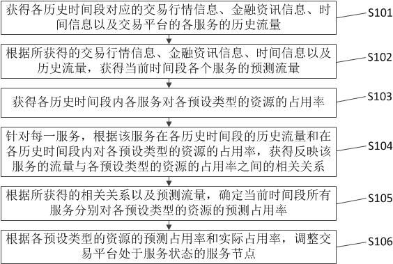 本发明实施例提供了一种服务伸缩方法、装置、电子设备及存储介质,涉及数据处理技术领域。服务伸缩方法包括:获得各历史时间段的交易行情信息、金融资讯信息、时间信息以及交易平台的各服务的历史流量;根据所获得的信息及历史流量,预测当前时间段各个服务的流量;获得各历史时间段内各服务对各预设类型的资源的占用率;针对每一服务,获得反映该服务的流量与资源的占用率之间的相关关系;根据所获得的相关关系以及预测流量,确定当前时间段所有服务分别对各预设类型的资源的预测占用率;根据各预设类型的资源的预测占用率和实际占用率,调整所述交易平台处于服务状态的服务节点。应用本发明实施例提供的方案能够准确地对服务节点数量进行调整。