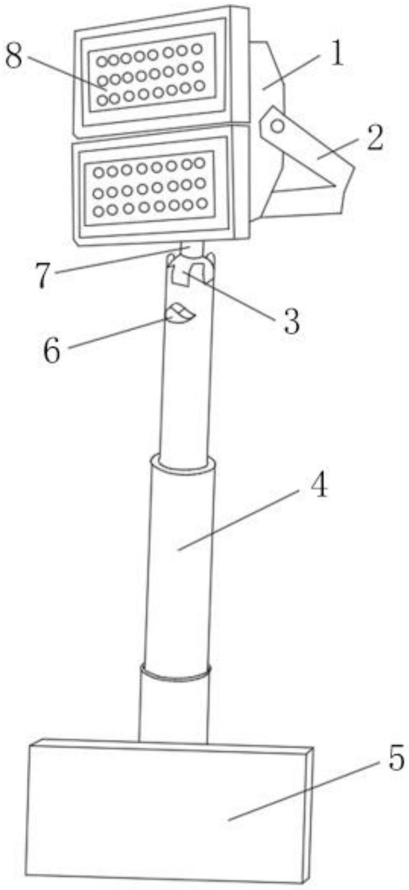 本实用新型公开了一种带伸缩杆的LED投光灯,包括底座和LED投光灯,所述LED投光灯包括灯座和灯板,所述灯座上固定连接有伸缩杆,该伸缩杆包括杆体、处于杆体顶端的凹槽和与凹槽配装的球头万向节,所述伸缩杆下端设有用于稳定LED投光灯的底座,伸缩杆上设有卡紧装置,所述灯座后端还设有提拉带。本实用新型结构简单合理,连接有伸缩杆,可自由调整至所需高度,方便照明,伸缩杆头部可带动LED投光灯转向多个位置,降低出现死角的情况,适用性更强。