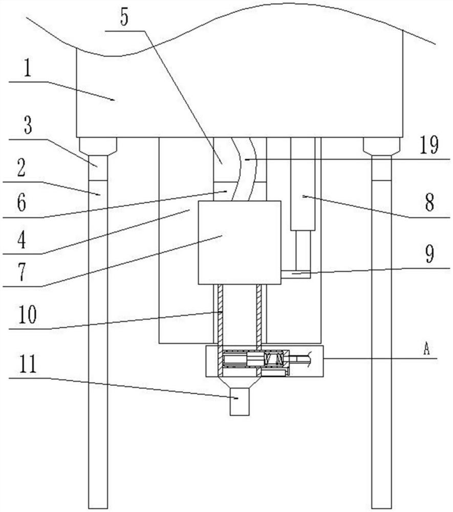 本实用新型涉及到润肤油灌装设备领域,具体涉及到润肤油灌装防震防漏装置。包括料仓,料仓下端四角均固定有减震脚,减震脚下端均固定有支腿,料仓下端固定有立板,立板前端滑动设置有抽料泵,抽料泵与料仓通过耐负压软管连通,立板上固定有驱动抽料泵上下运动的上驱动装置,抽料泵下侧的出口端上固定有竖直的方管,方管下端固定有出料嘴。本实用新型,结构简单,操作方便,能够对灌装设备进行有效的减震,防止出料嘴内残余的润肤油漏出后滴落到容器外表或运输设备中,能够避免润肤油浪费。